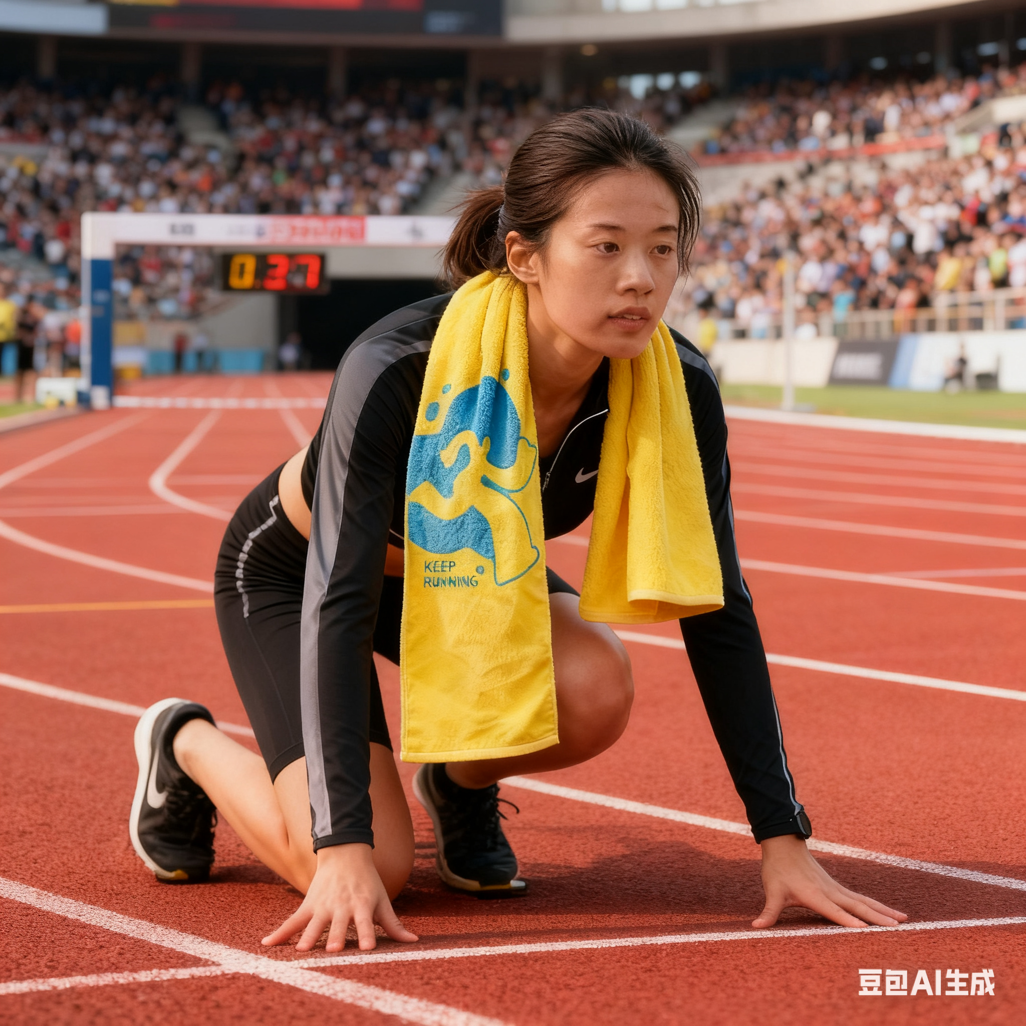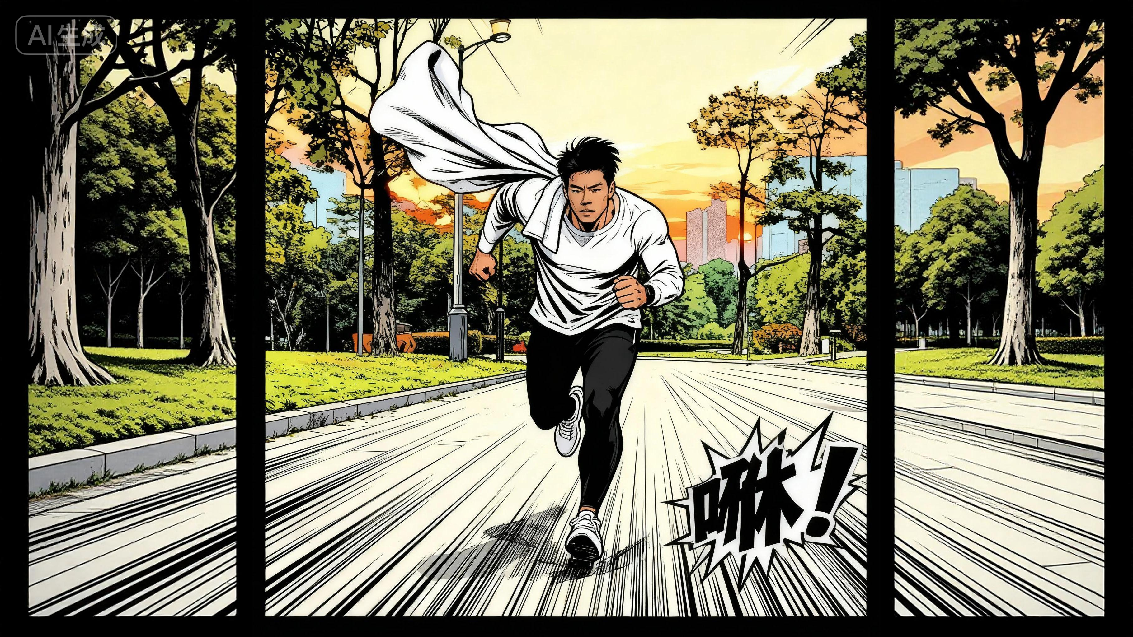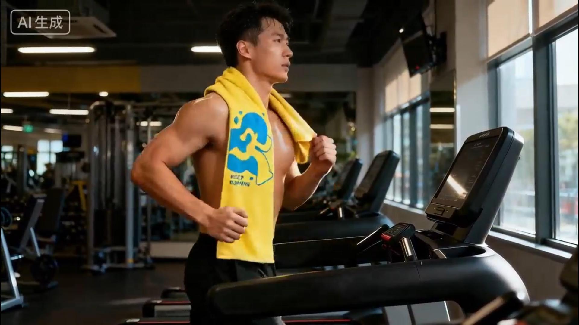 早起困难户小明被金号宝宝叫醒去晨跑,金宝化身最佳运动伙伴,展现金号毛巾吸汗、速干等功能。