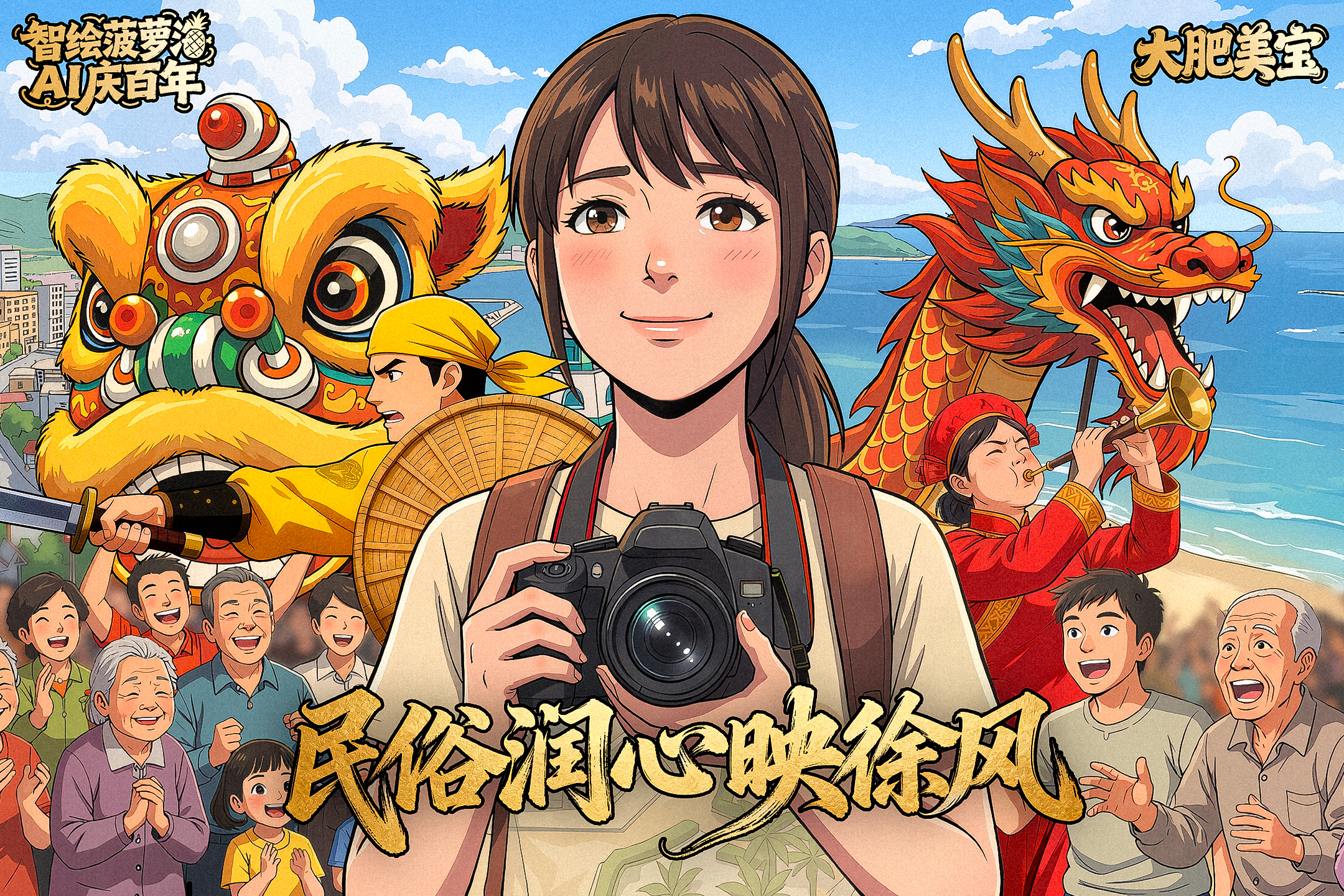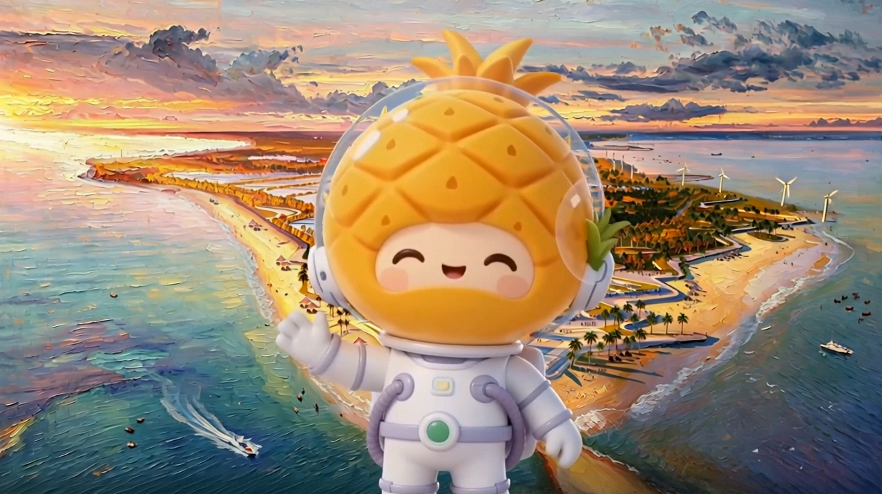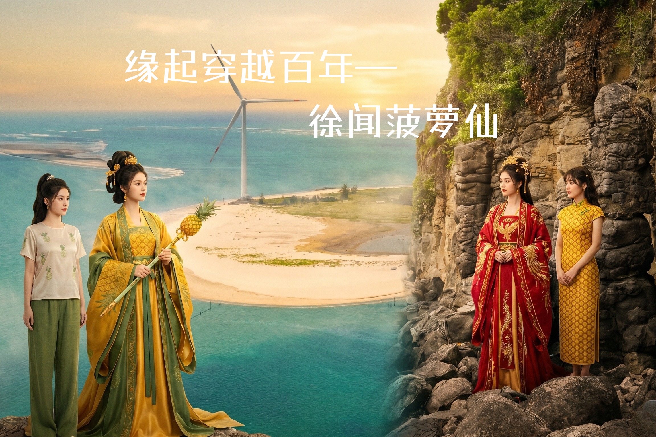 以一幅名为《徐闻记》的数字卷轴展开,将徐闻最具代表性的海岸、灯塔、南极村、白沙湾、菠萝田、盐田、人文街巷到后面与现代文旅结合,自然与人文胜景,融入浓墨重彩的敦煌岩彩美学之中。画面以金、青、朱、紫等矿物色为基调,通过勾金线条、重彩块面与壁画质感的创新表现,编织成一幅古今交融、生生不息的南国山海画卷。