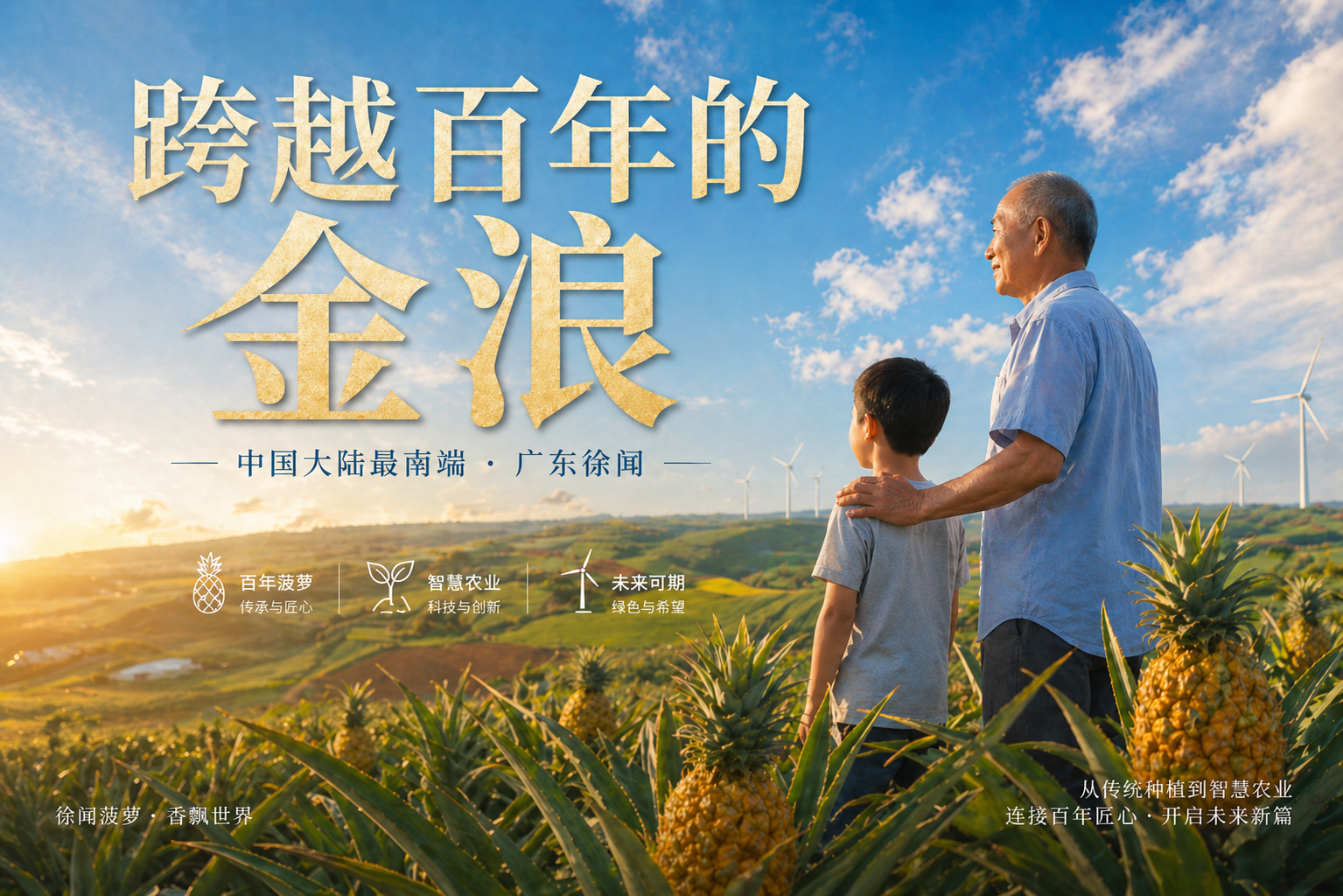 在中国大陆最南端的广东徐闻,激荡着一片三十七万亩的璀璨金海。本片以时间为轴,深情聚焦徐闻菠萝跨越一个世纪的农业传奇。 从1926年先驱乘风破浪护送而来的第一批种苗,到如今大机器轰鸣与无人机交织的现代农业奇观,影片通过极具视觉张力的FPV穿越机航拍与一镜到底手法,将历史的厚重与新时代的发展完美融合。 镜头定格于红土地上爷孙两代的温情对话,在“看你们的了”的深情期盼中,完成了一场跨越时空的精神交接。