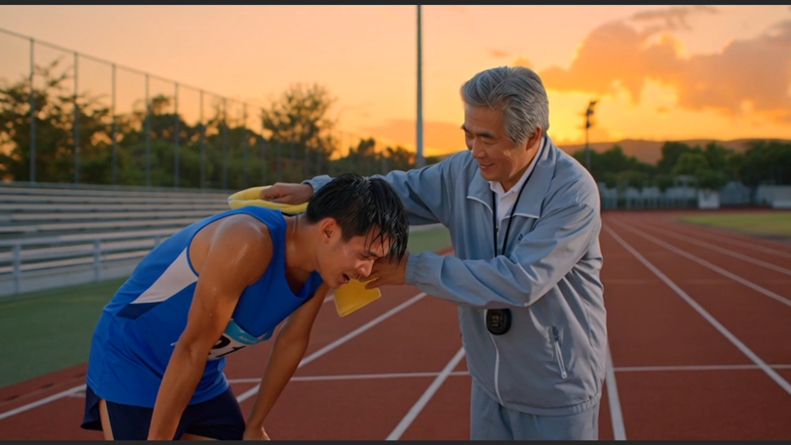 这是一段聚焦运动赛场师徒情谊的短篇文字,以跑步运动员冲线后的瞬间为切入点,捕捉教练递上毛巾的温情场景。赛道上的奋力拼搏、汗水浸透的疲惫,都在教练一句认可的鼓励、一次自然的擦拭中化为踏实的暖意。文字不渲染竞技的激烈对抗,转而聚焦赛场背后的陪伴与支撑,诠释了体育精神中超越胜负的信任与羁绊——每一份荣耀的背后,都有双向奔赴的坚守与期许。
