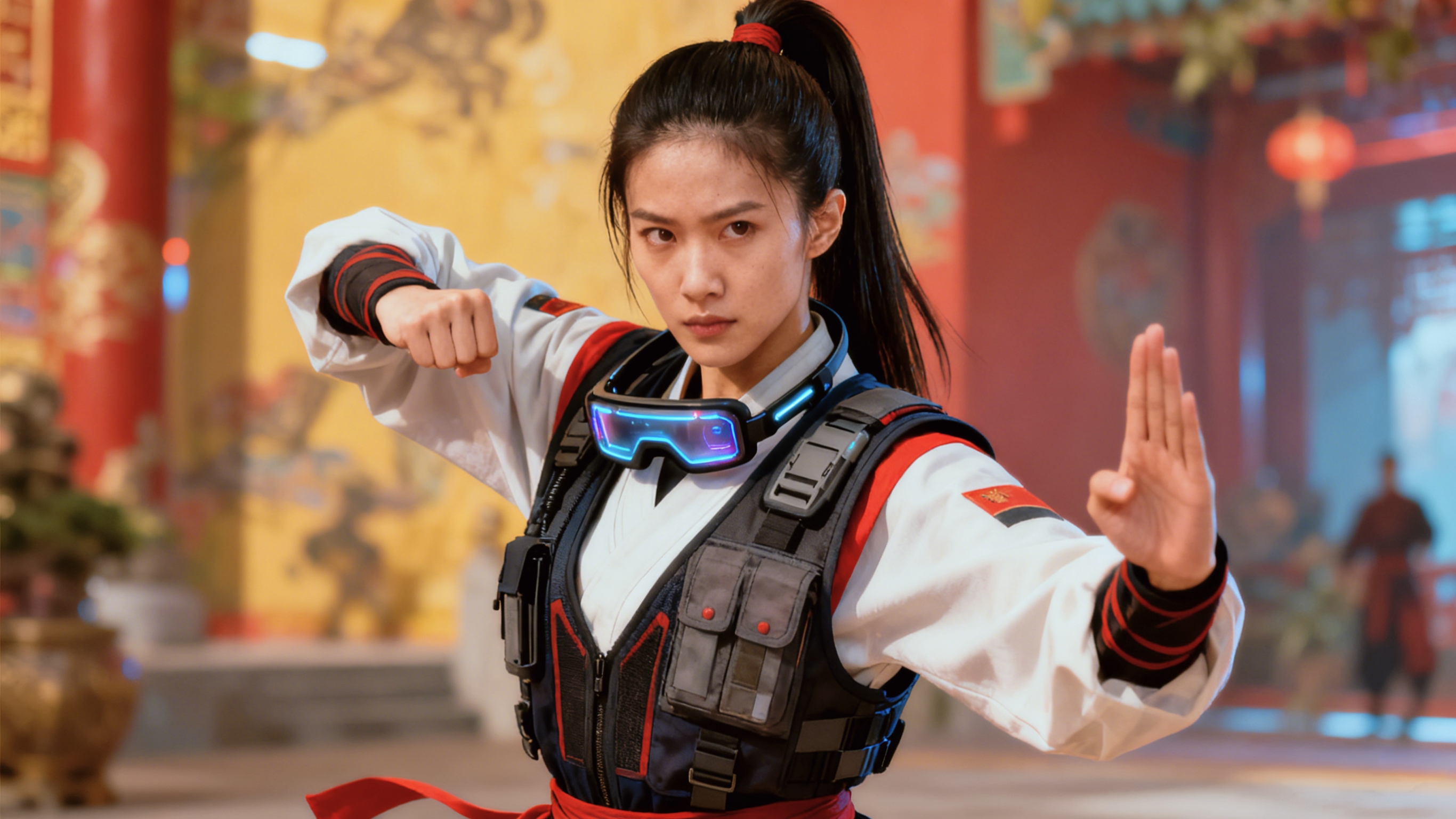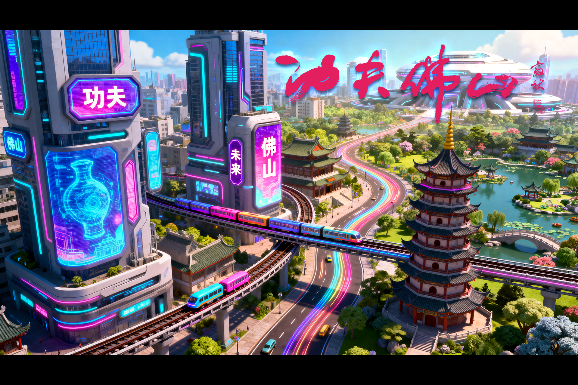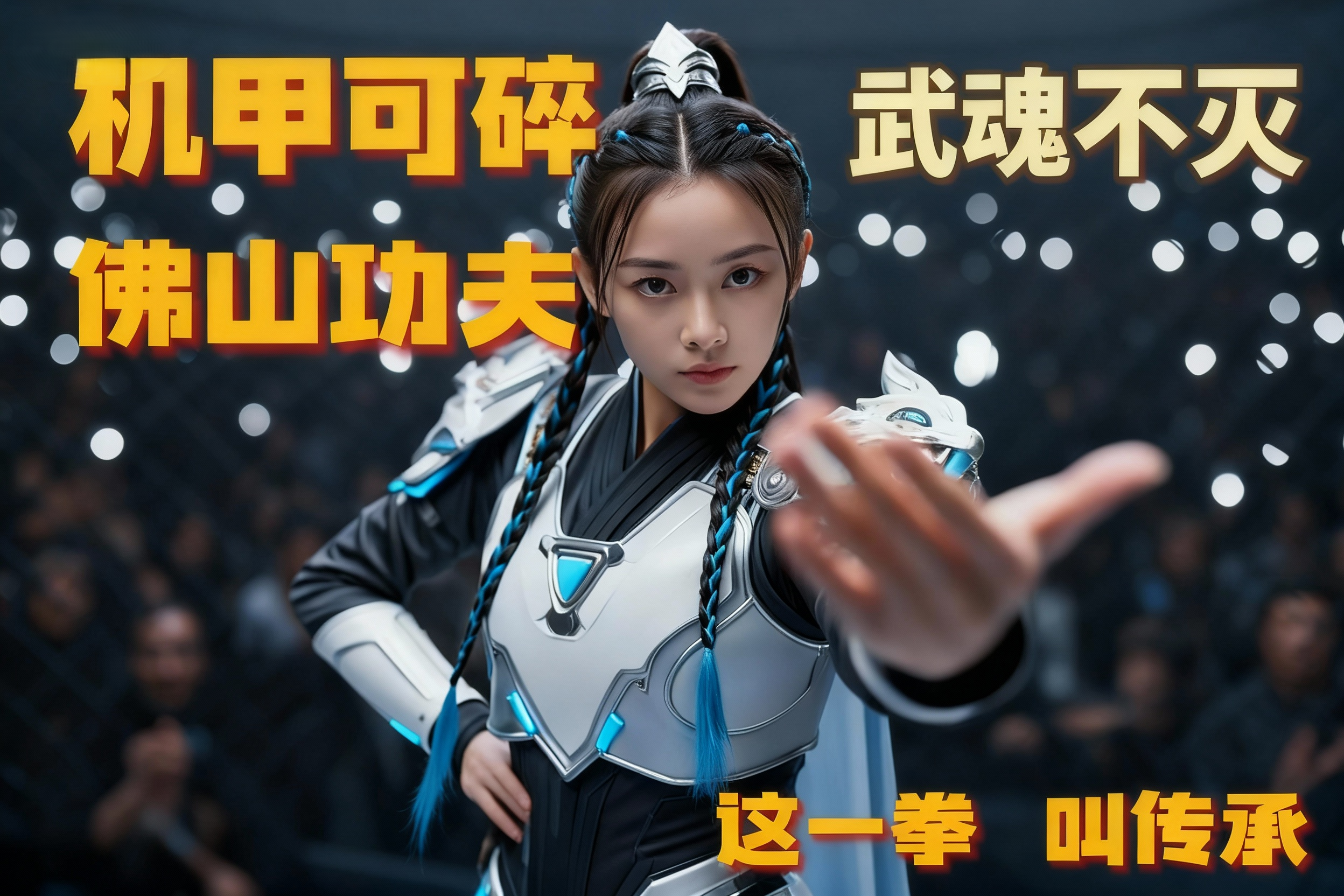 当国风古韵邂逅赛博锋芒,《功夫佛山》借  AI  之力破壁而来。以佛山功夫为魂,让传统招式在机械义肢、赛博机甲间流淌,重塑功夫传承新形态。  AI  勾勒赛博佛山图景,古建灯笼与飘零红瓣打底,机甲武者负剑而立,将南派功夫的刚劲与科技的冷峻融合,让功夫从街头武馆跃入数字未来,在传承中突破边界,用赛博美学续写佛山功夫的热血与筋骨,开启一场传统与未来共舞的功夫新叙事  。