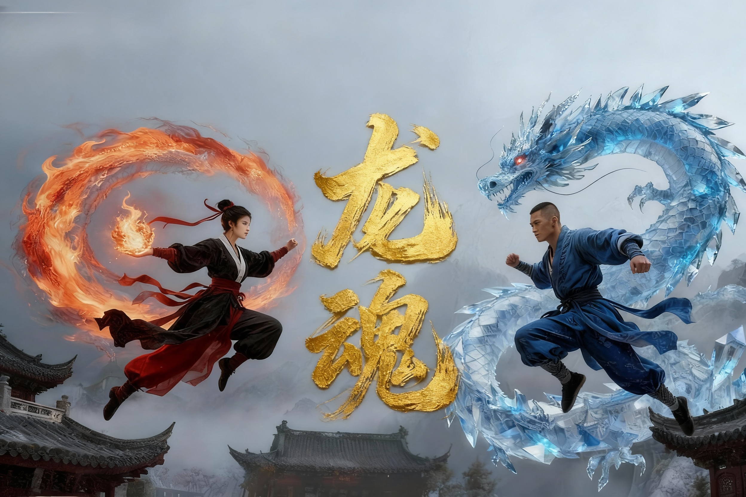 《龙魂》以佛山祖庙双龙壁为背景,通过火与冰的对立象征功夫精神的不同侧面。红衣女子凌厉炽烈;蓝衣青年沉稳内敛。二人以无影脚、咏春粘打等经典技法交锋,让传统武学在镜头中焕发新意。  随着对战升级,招式延展为元素之力的碰撞:火焰与寒气交错,象征情感与理性的较量。最终蓝龙取胜,寓意冷静与坚守使力量得以贯通。《龙魂》象征中国人内在的精神气韵。影片以  AI  视觉融合功夫表现,呈现出传统武学在新时代中的活化与传承