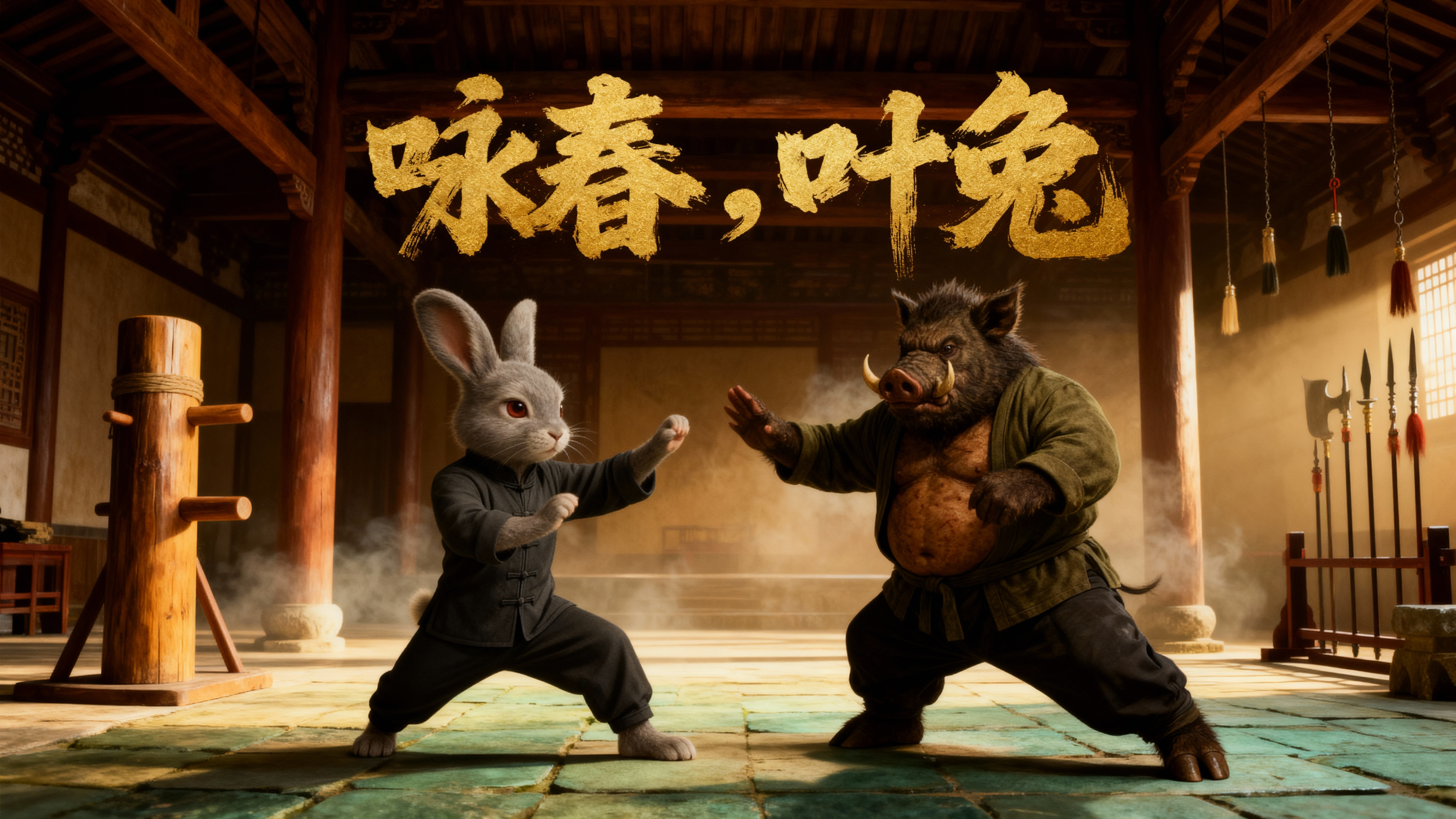 在一家拥挤凌乱的中式木制家具客厅里,嚣张的黑帮老大“野猪金山”带着一身蛮肉前来踢馆。面对野猪的蛮力冲撞,身材娇小的“宗师兔”(身穿黑色唐装)展现了咏春拳的精髓。宗师兔不退反进,利用灵敏的长耳朵“听桥”,化解重拳。随后,宗师兔爆发了每秒十拳的“日字冲拳”,极速的打击让野猪引以为傲的脂肪层产生剧烈的波浪震颤。最后,以一记寸劲将野猪击飞,兔子优雅收势。