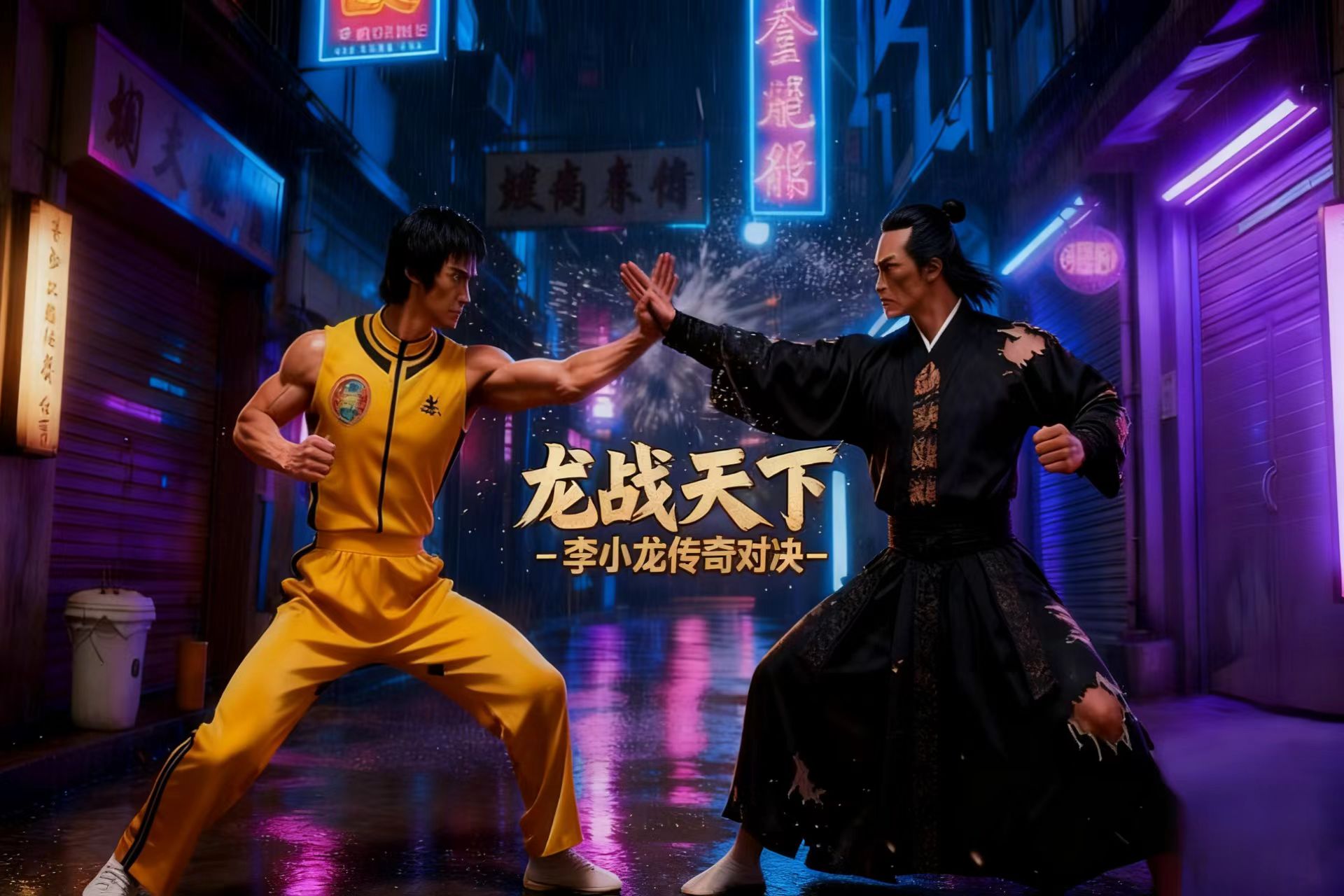 以音乐的方式开启了一段故事,创作了一个振奋人心的国漫风格功夫短片,完美融合了爱国情怀、精彩武打和深刻的文化内涵。赛博朋克武侠风,传统与现代完美融合  主题:爱国情怀  +  功夫精神  +  民族自信  故事梗概1972  年香港,日本空手道高手山口雄一挑衅中国功夫,李小龙挺身而出,用截拳道展现中国功夫的真正威力,维护民族尊严的AIMV