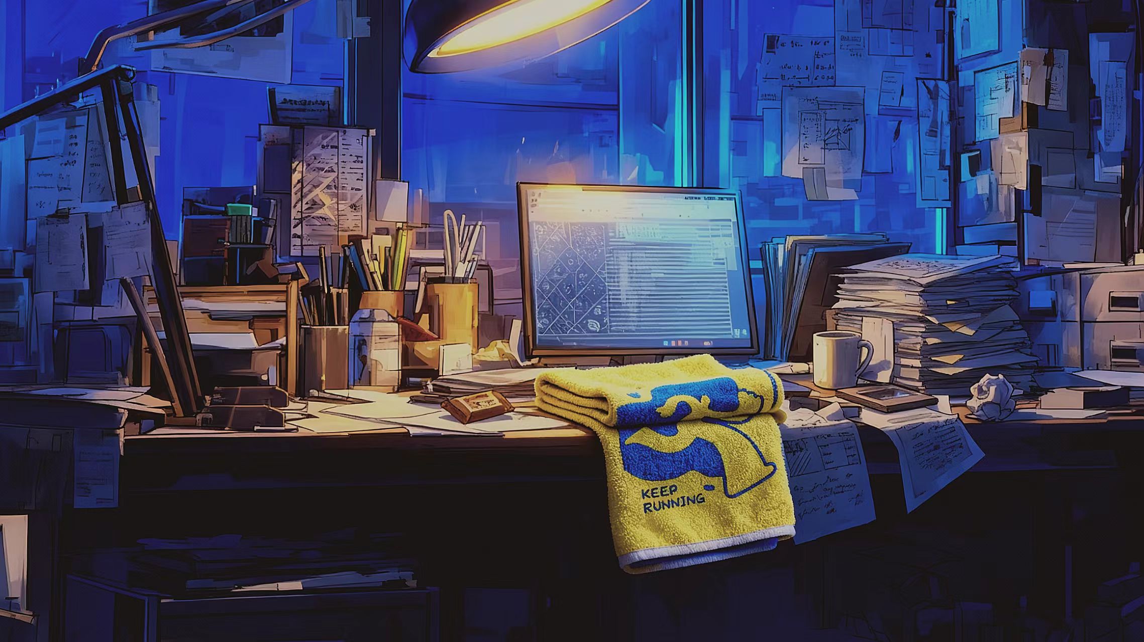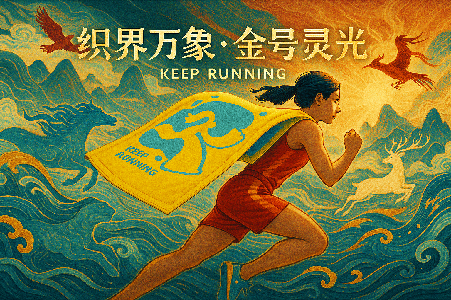 《织界万象·金号灵光》以“汗水化光、奔跑不息”为核心主题,融合体育精神与东方美学意象。作品通过女子奔跑的画面,展现从汗水到光、从努力到信念的转化。金号毛巾象征守护与延续,承载着每一位运动者的力量与梦想。画面以金蓝为主调,贯穿“光之经纬”概念,象征品牌的科技温度与精神深度,传递“KEEP  RUNNING”的永恒信念。