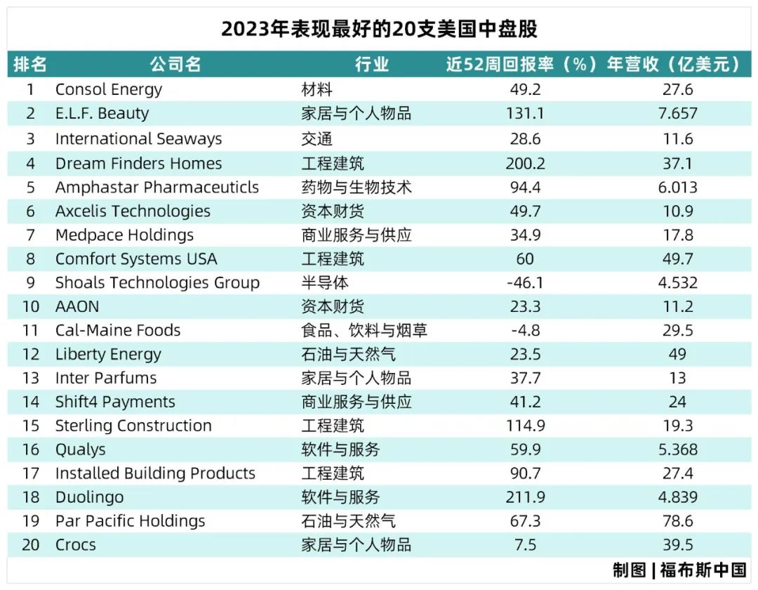 Dream Finders往往比大盘股波动更大,特别是由于Zalupski持有该公司的大部分股份,其流通股相对较低,但投资者在小盘股中承担更大风险的同时也有机会获得更高回报。中盘股榜单上的其他一些股票都是知名品牌,比如排在第20位的卡骆驰(Crocs),排在第57位的连锁餐厅Texas Roadhouse,以及排在第75位的Abercrombie & Fitch。Abercrombie & Fitch在2023年迎来了复兴,突破了2000年代中期的历史高点。除了最精明的投资者,其他大多数人可能对它们都不熟悉,但有些上榜者可能是代表下一代股市领导者的彩票。