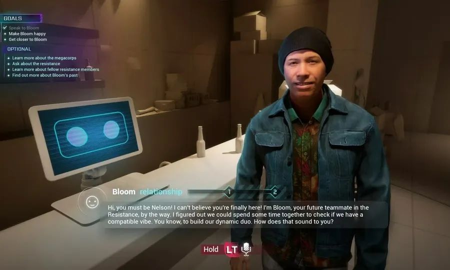 在第一个场景里,主角正在和一位NPC Bloom进行由人工智能所生成的对话,他被设定成玩家在反抗组织里的成员,玩家可以通过简单的语音输入和Bloom进行流畅、自然的对话。