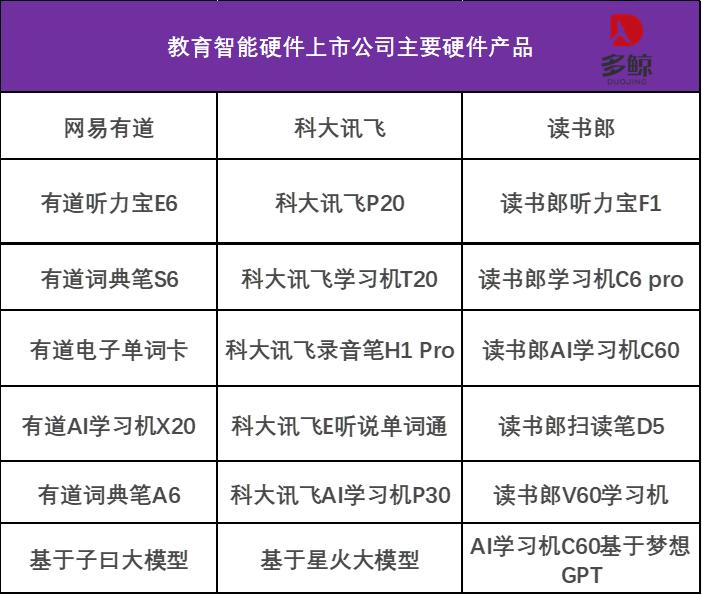 网易有道、科大讯飞和读书郎作为教育智能硬件行业的领头羊,一直致力于科技研发和产品更新。目前,三家公司的主要硬件产品包含学习机、听力宝、词典笔多个品类。