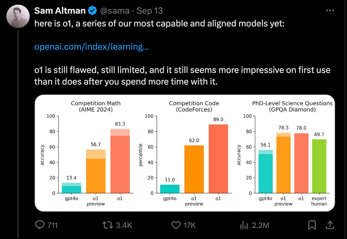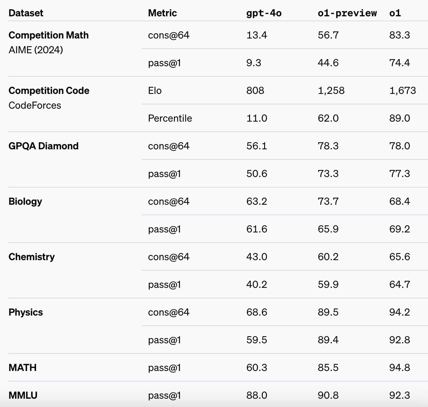 从OpenAI公布的大模型测试结果来看,此次发布的o1-preview、o1-mini并不是满血版