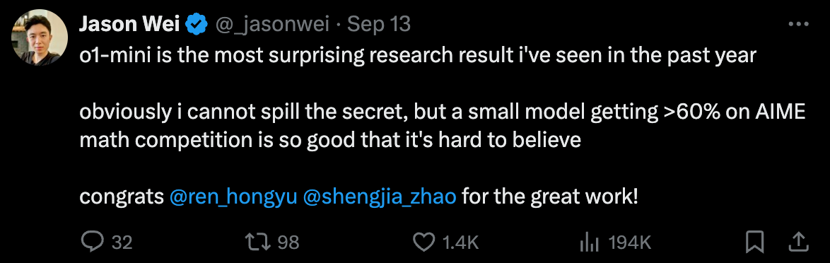 OpenAI研究员Jason Wei表示,o1-mini是自己过去一年看到的最令人惊讶的研究成果。一个小模型,居然在AIME数学竞赛中获得了高于60%的成绩。