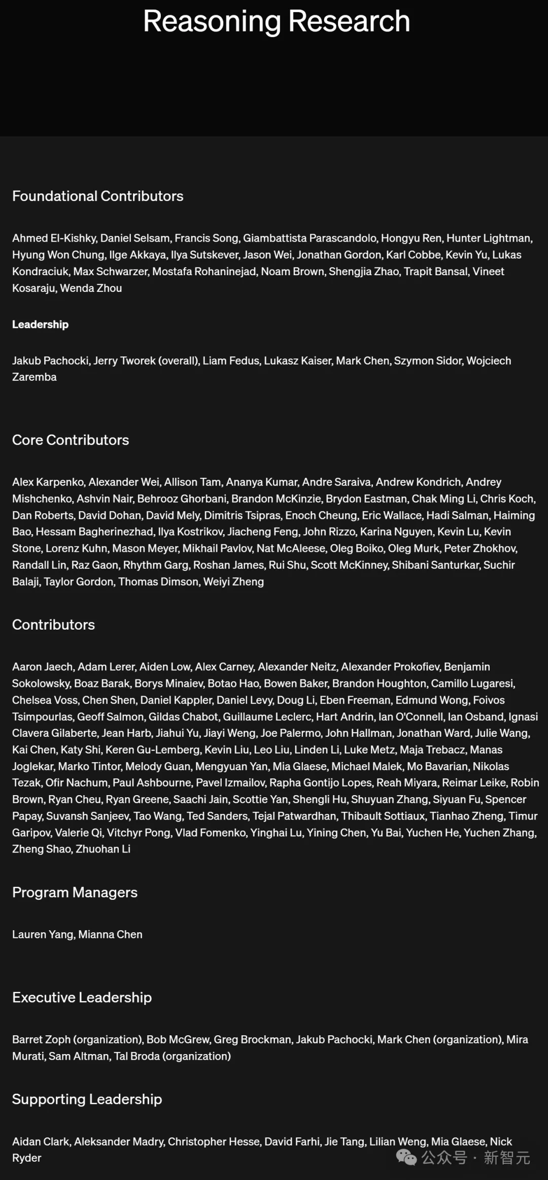 Ilya Sutskever,在奠基贡献者里,离职创业的Ilya Sutskever赫然在列,但并没有和Greg Brockman等人被列在执行管理(executive leadership)中,想必是他之前的研究工作为o1奠定了基础。