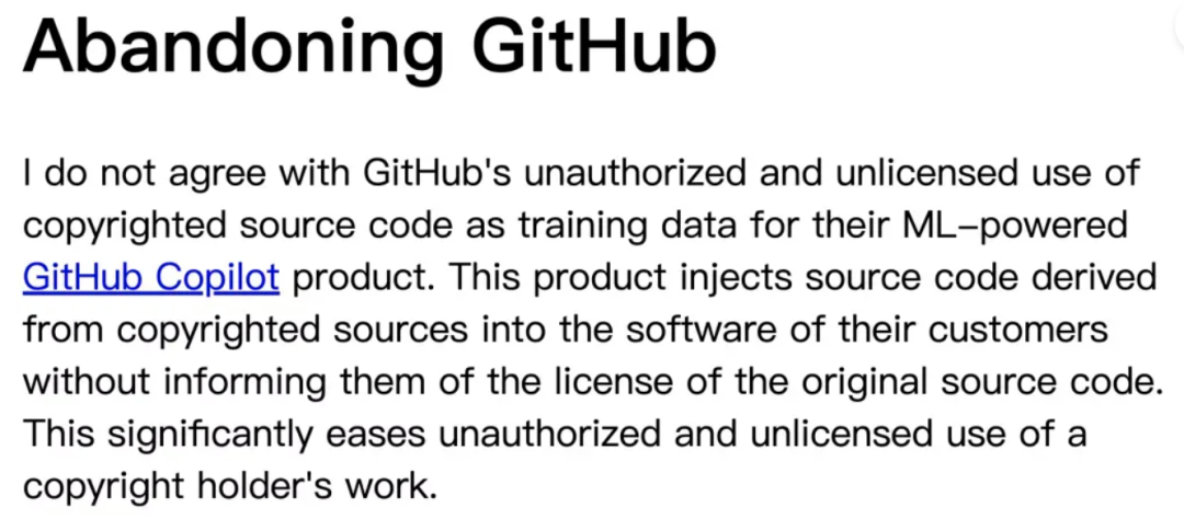 除了 Reddit 和 Stack Overflow 这类大型网站,甚至在开发者圈子中,部分程序员也因 Copilot 涉嫌侵犯代码版权宣称要弃用 GitHub: