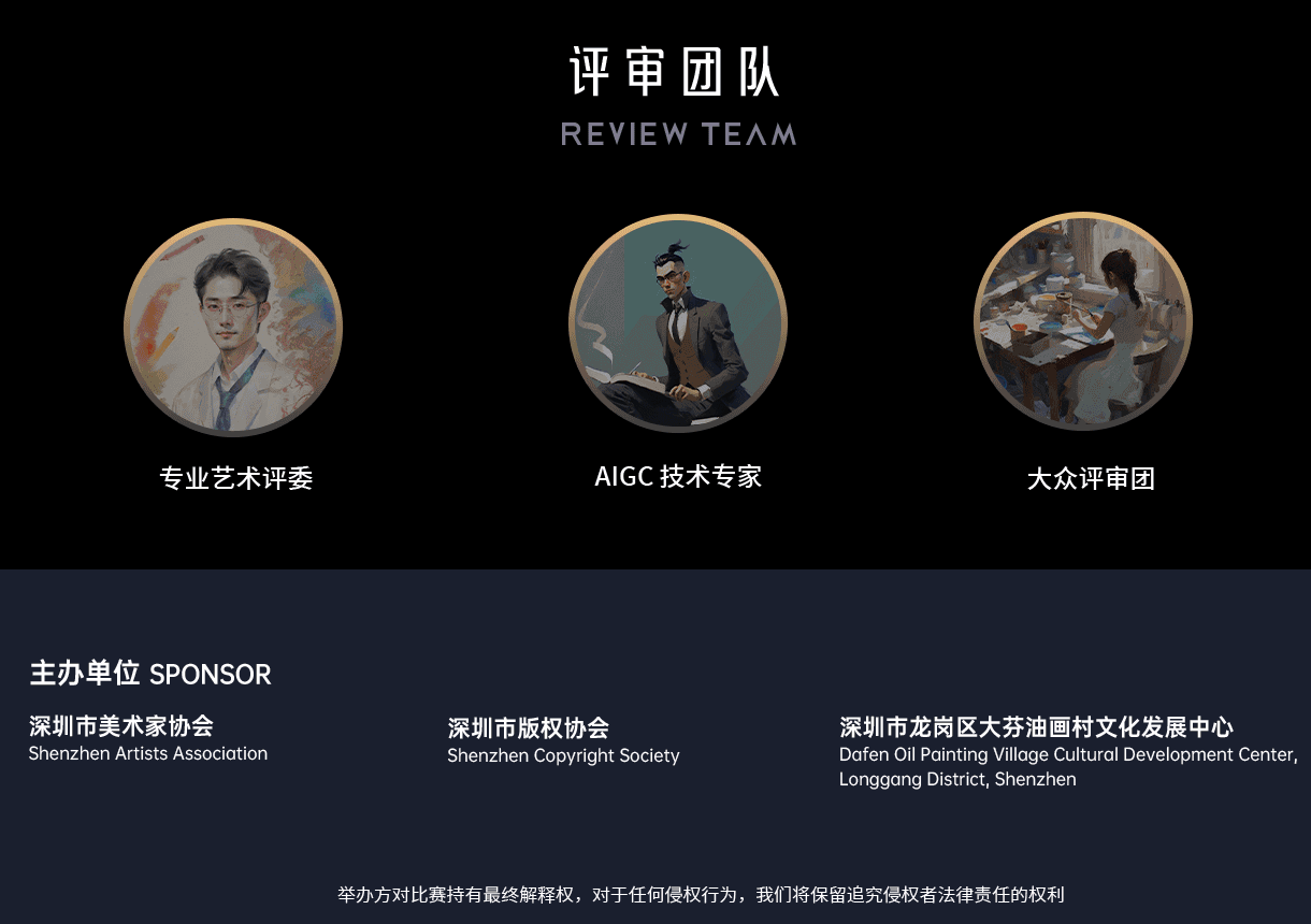 本次大芬首届AIGC创意大赛的评审团队由专业艺术评委、AIGC技术专家、大众评审团共同组成