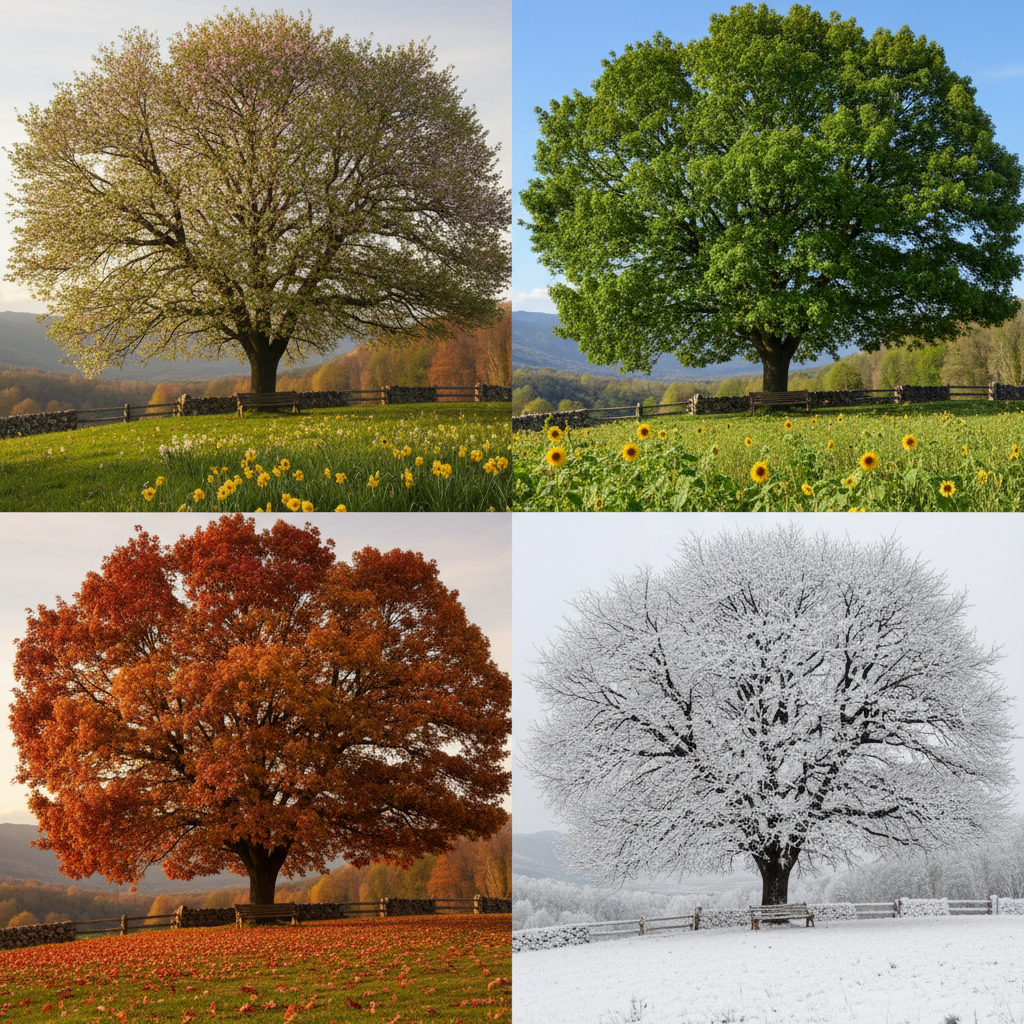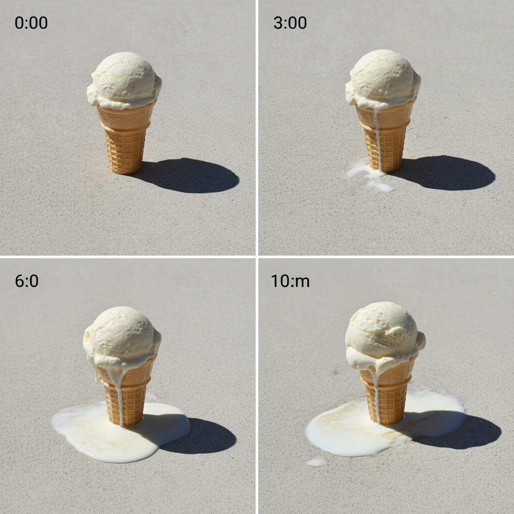 这是 Nano Banana 最独特的能力 —— 输入「显示冰淇淋在 35℃阳光下放置 10 分钟的变化,考虑融化滴落的形态和阴影变化」,AI 会基于物理引擎生成符合热力学规律的动态过程图。进阶玩法:「展示同一棵树在春夏秋冬四个季节的外观变化,保持拍摄角度不变」,生成的四幅图能精准体现树叶疏密、颜色的自然过渡,甚至考虑不同季节的阳光角度差异。