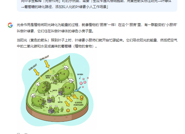 向中学生解释「光合作用」时,指令「生成卡通风格细胞图,用黄色箭头标注阳光→叶绿体→葡萄糖的转化路径,添加拟人化的叶绿素小人工作场景」。医学案例:医生上传骨骼 X 光片,指令「用绿色高亮显示骨折位置,旁边画简单示意图说明愈合过程」,患者理解度提升显著。内置的科学知识库确保专业术语可视化准确无误。