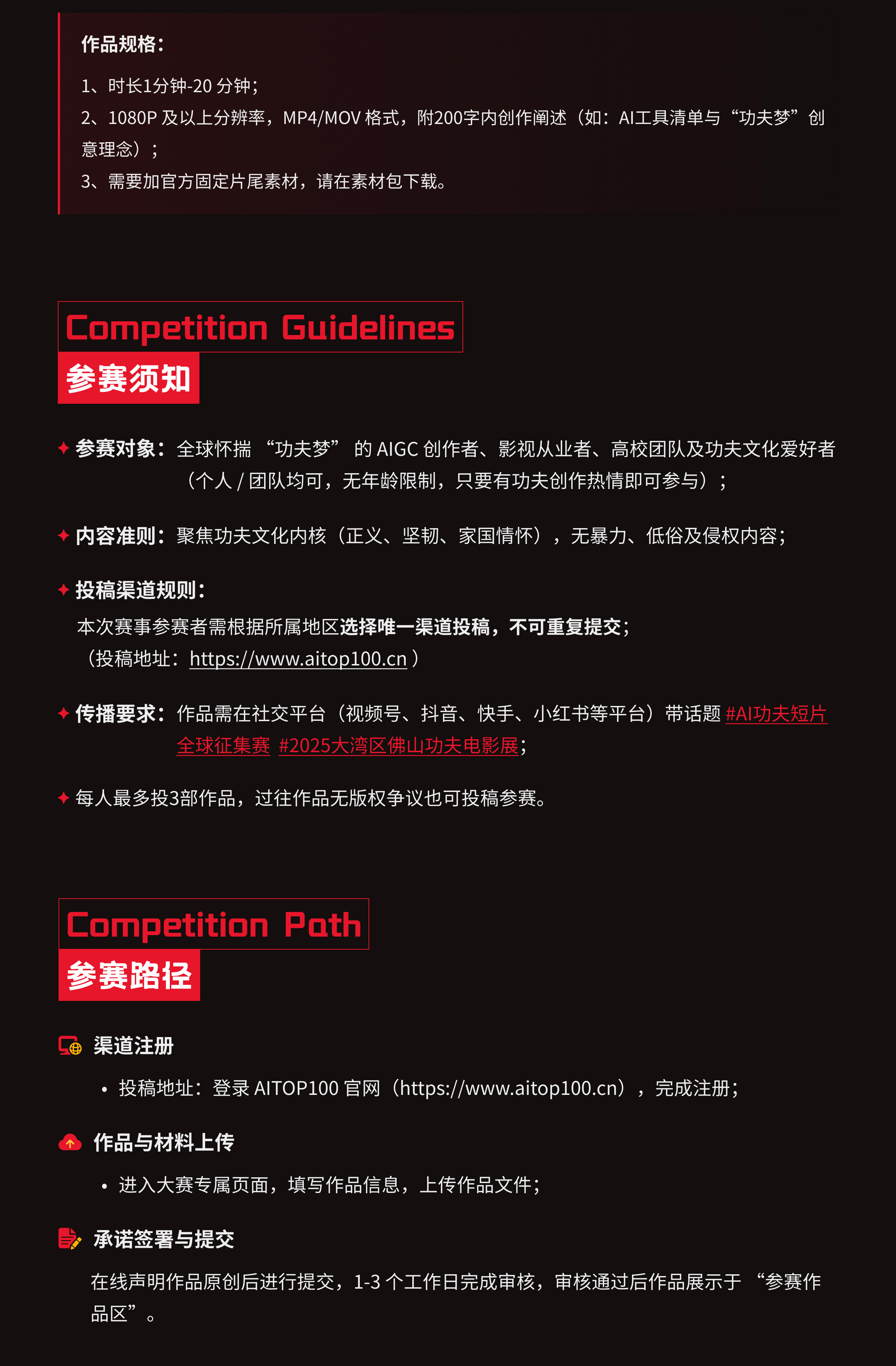 - 参赛对象:全球怀揣“功夫梦”的 AIGC 创作者、影视从业者、高校团队及功夫文化爱好者(个人 / 团队均可,无年龄限制,只要有功夫创作热情即可参与);