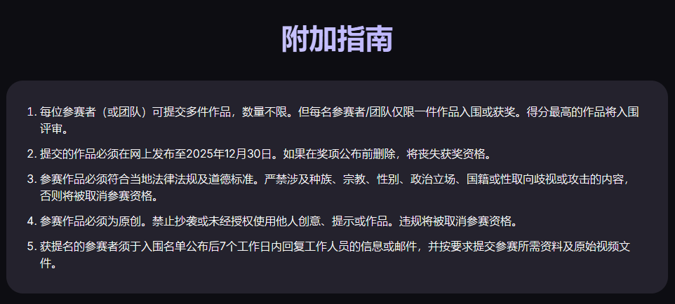 - 发布期限:提交的作品必须在网上发布至2025年12月30日。若在奖项公布前删除,将丧失获奖资格。