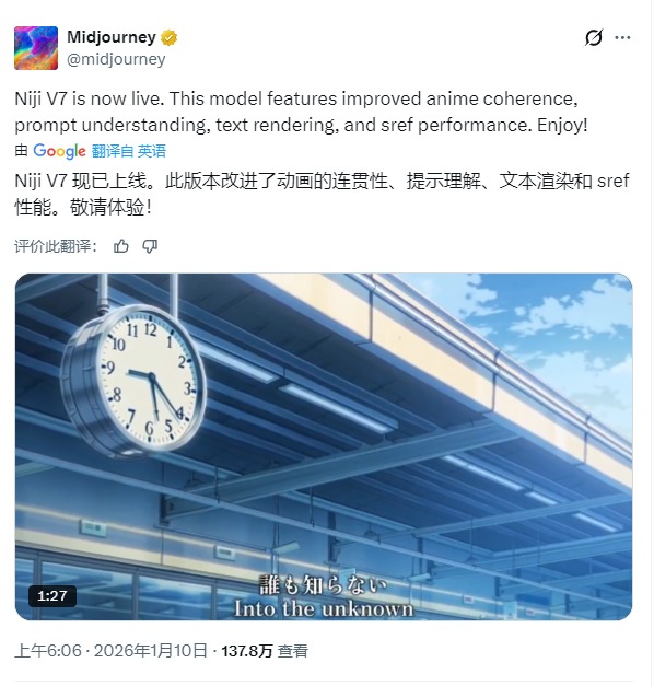 2026年1月9日,Midjourney与Spellbrush团队联合推出的动漫AI绘图模型Niji 7正式上线。这是继Niji 6发布一年半后的重磅更新,新版本在画面连贯性、细节表现力、提示词理解能力等核心维度实现全面跃升,为动漫与东方插画创作领域带来晶透级清晰度的极致体验。