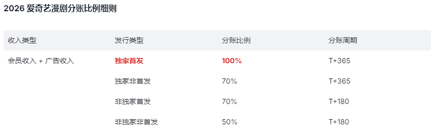 在全新的分账合作模式下,爱奇艺针对不同发行类型的内容给予差异化的资源推广与收益倾斜。其中,独家首发内容将获得最高级别的扶持,分账比例最高可达 100%。