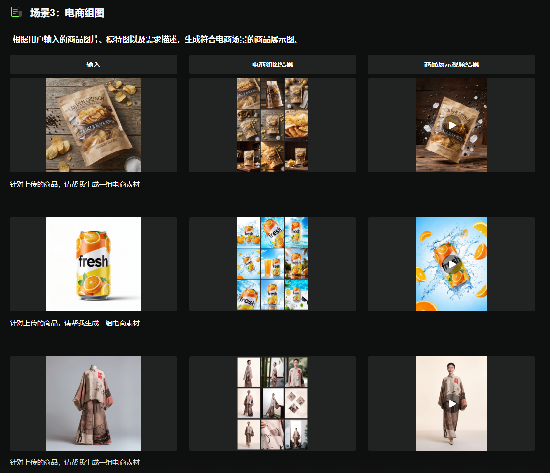 电商物料自动化:针对商品展示,系统不仅能生成静态的电商组图,还能生成动态的商品展示视频,覆盖从详情页到短视频推广的全套需求。