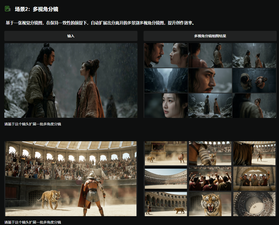多视角分镜扩展:基于单张参考图,系统可自动推理并扩展出不同景别(如特写、远景)和不同视角的画面,极大丰富了故事素材库。