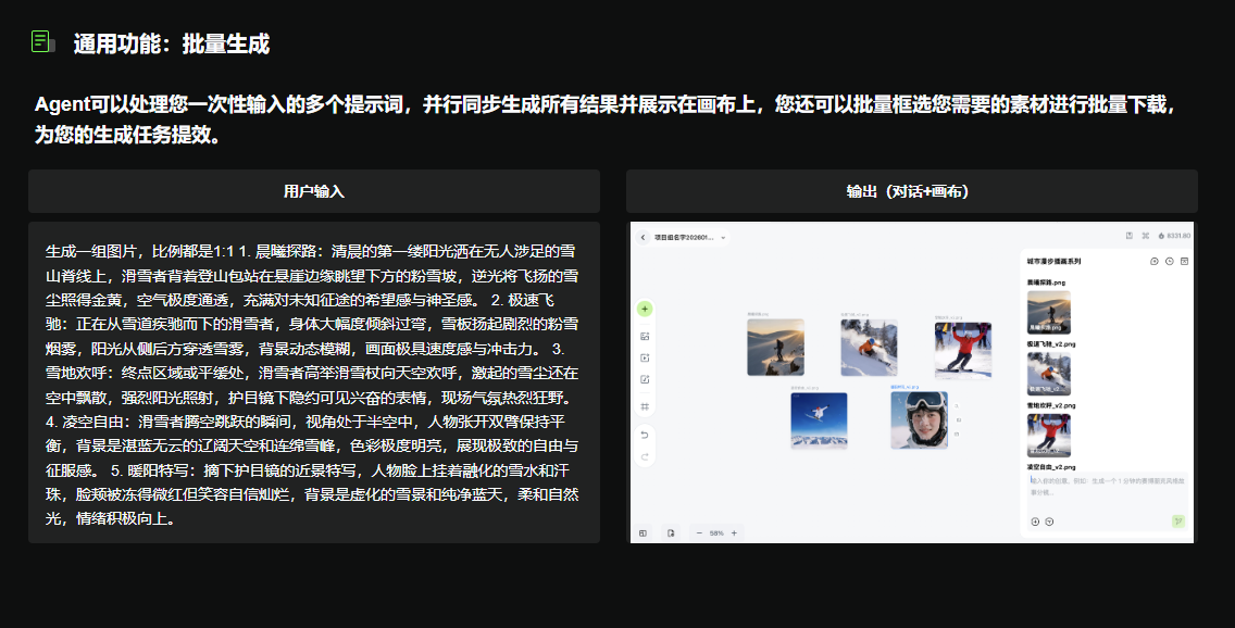 高并发批量生成:支持多指令并行处理,用户可一次性发送多个生成任务,并在统一画布上批量选择与下载结果,显著提升产出效率。