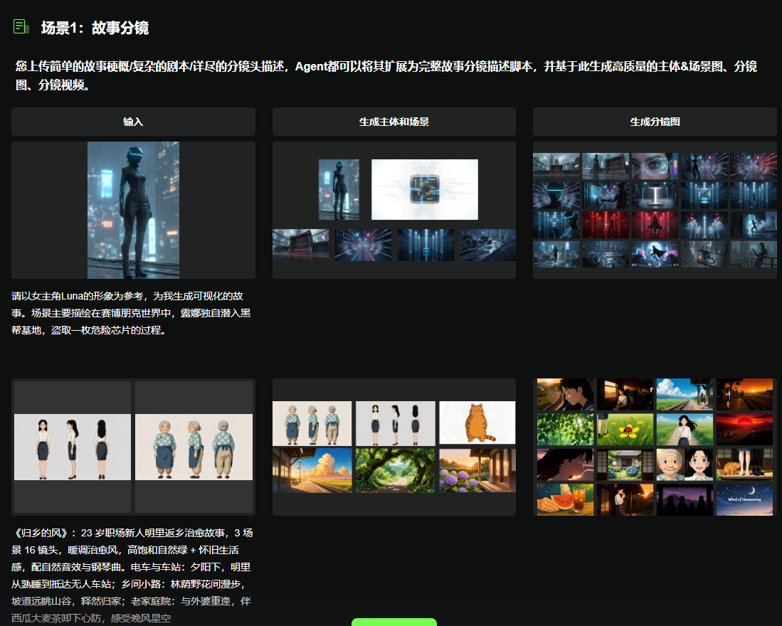 故事分镜生成:无论是简单的故事梗概还是复杂的剧本描述,Agent 都能将其拆解为完整的分镜脚本,并输出对应的高质量主体图与场景图。例如在 “赛博朋克” 题材中,系统能精准还原女主角潜入基地的全过程。