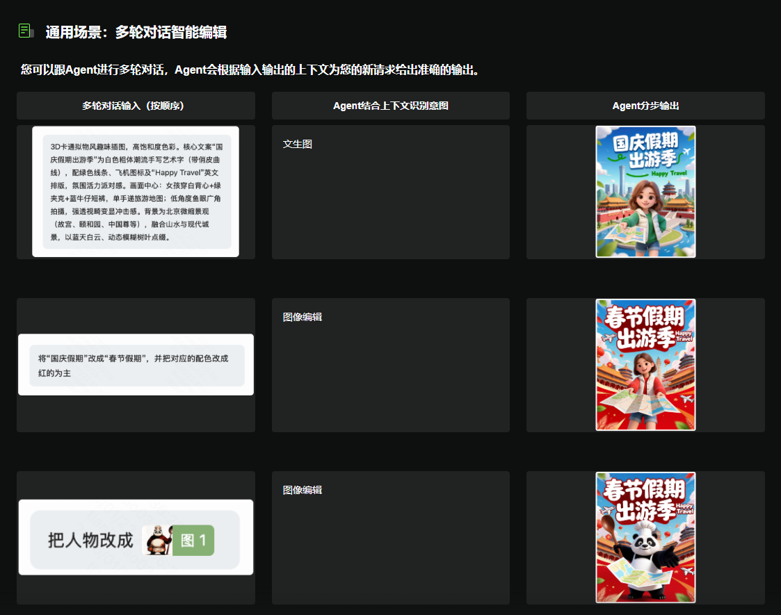 多轮对话智能编辑:支持自然语言多轮交互,Agent 能结合上下文理解用户意图,分步执行文生图、图像编辑及批量图生图操作,实现精准的细节调整。
