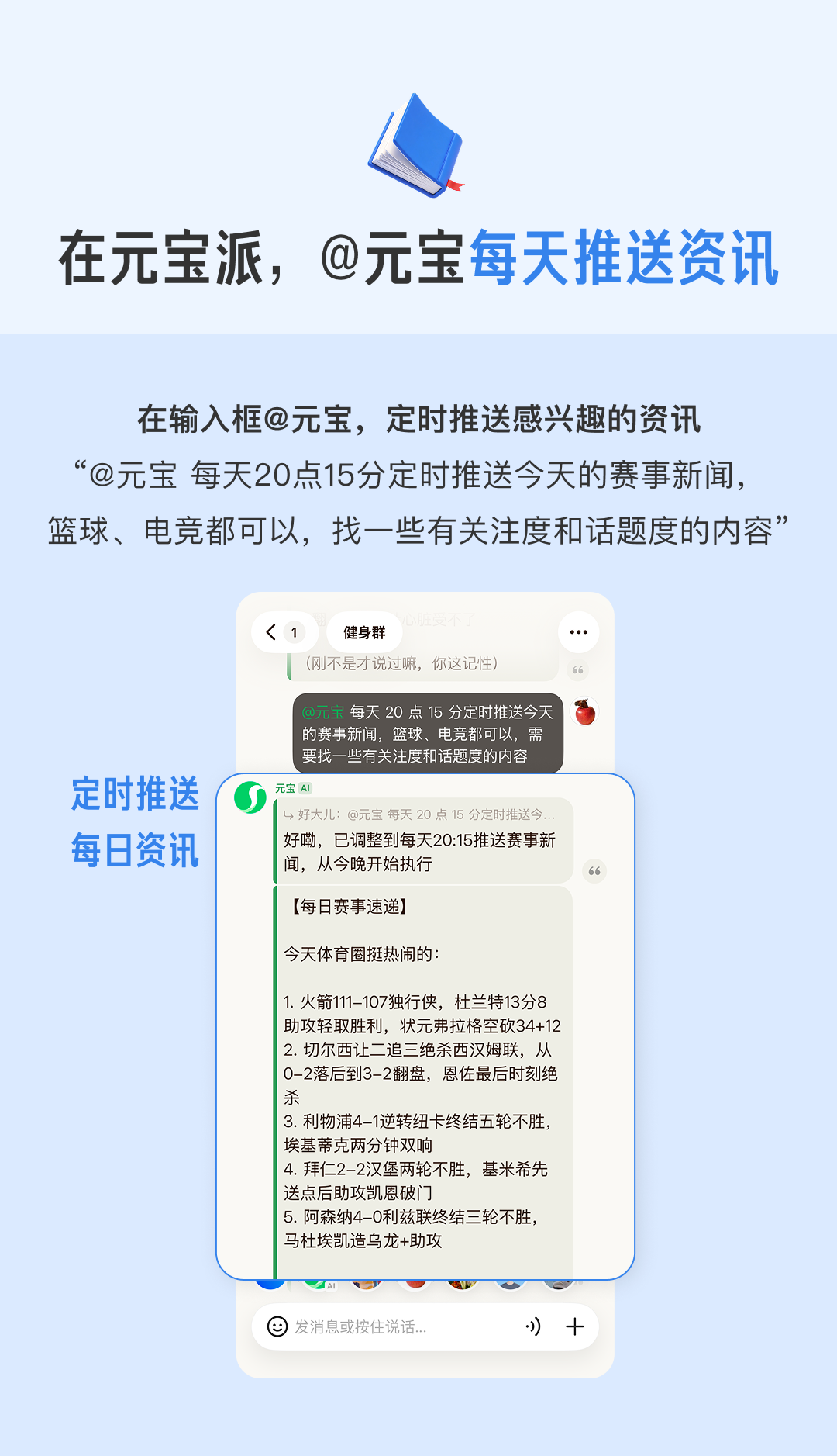 每日赛事与资讯速递在信息爆炸的群聊环境中,@元宝充当了即时新闻播报员的角色。它能够实时抓取并播报热点赛况,例如“火箭111-107独行侠”“切尔西让二追三绝杀西汉姆联”等关键比分与球员表现(如杜兰特13分8助攻)。这种即时播报机制,确保了派友无需跳出聊天窗口即可同步掌握外部动态。