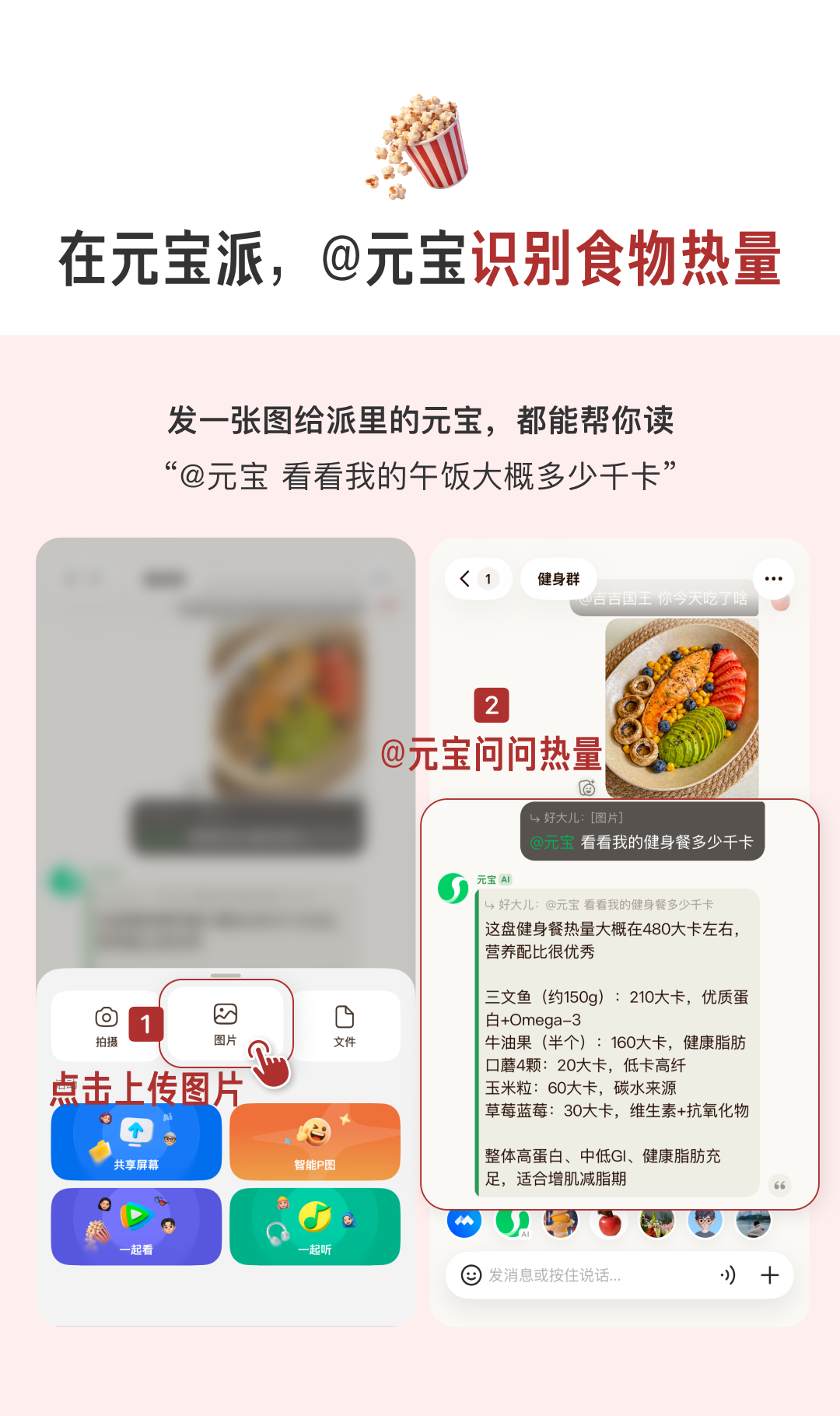 @元宝识别食物热量针对健康管理需求,元宝派提供了便捷的视觉识别入口。用户只需在聊天框中发送一张餐饮图片并提问:“@元宝看看我的午饭大概多少千卡”,助手即可实时分析图片中的主要食材构成,并给出热量估算数据。这一功能将复杂的视觉分析模型降维至日常聊天中,极大降低了用户获取健康信息的门槛。