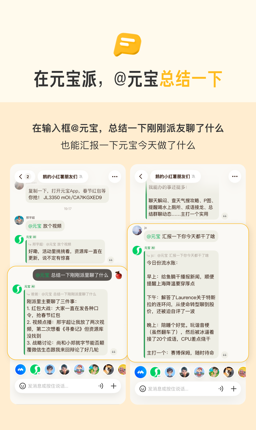 · 即用即走的操作流:无需复杂的插件安装或后台设置,所有的AI能力均通过自然语言交互(@元宝)触发。这种设计最大化了使用的便捷性,使得AI助手真正成为对话流的一部分。