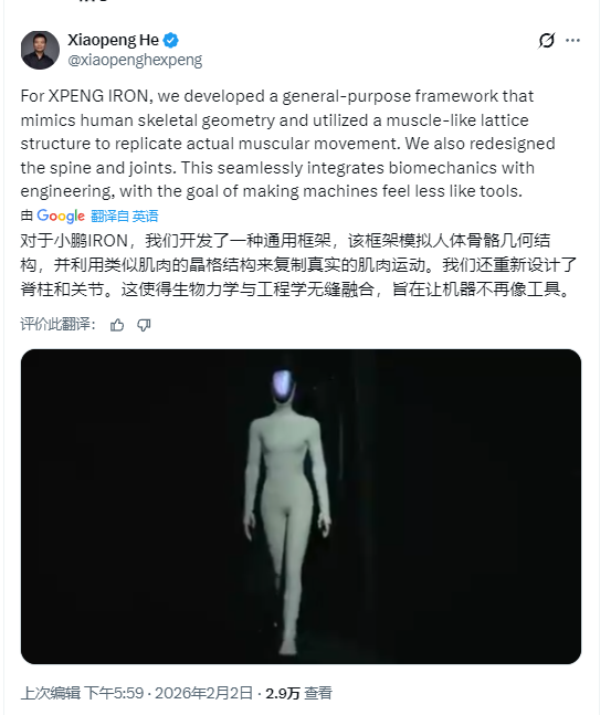 2026年2月2日,何小鹏在社交媒体平台正式披露了XPENG IRON的最新技术细节。他表示,XPENG IRON采用了一套模拟人体骨骼几何的通用仿生框架,并引入了“肌肉样格构”(Muscle-like Lattice)结构来复现真实的肌肉运动。同时,研发团队对机器人的脊柱与关节进行了重新设计,旨在将生物力学与工程学深度融合,让机器 “更像生命体”,而不再仅仅是冰冷的工具。