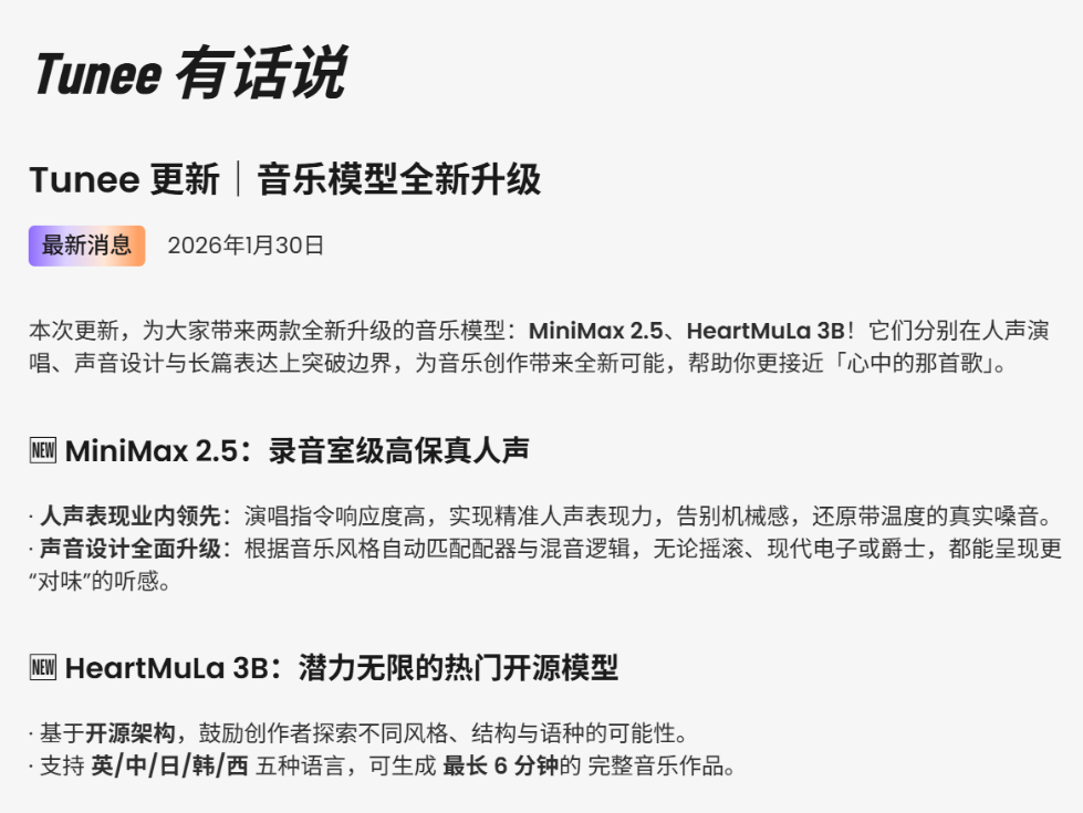2026年1月30日,Tunee 正式宣布旗下音乐模型迎来重大升级,推出 MiniMax 2.5 与 HeartMuLa 3B 两款全新模型。此次更新分别针对 “录音室级真人声” 与 “长篇多语种表达” 两大痛点进行突破,为创作者带来了人声演唱、声音设计与跨语种创作的全新能力。