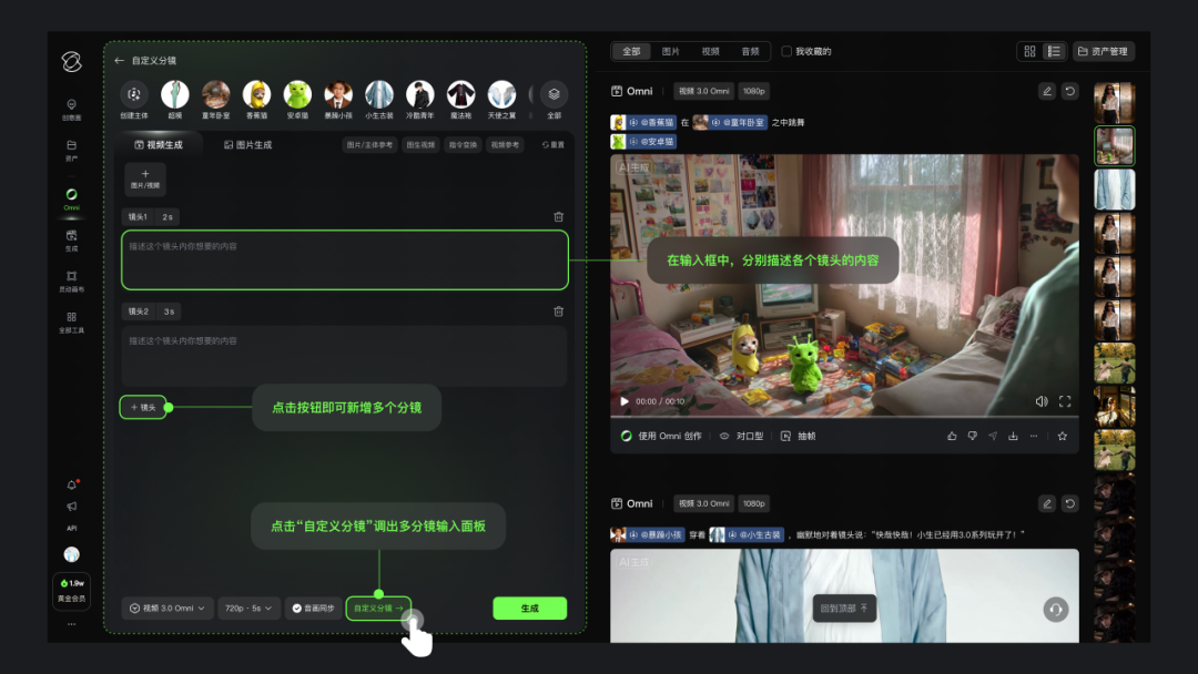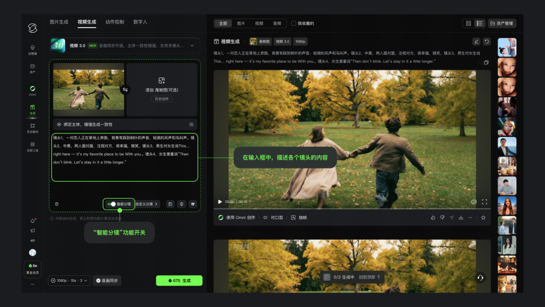 更具革命性的是智能分镜系统的引入。创作者不再需要像 “抽盲盒” 一样等待结果,而是可以通过文字指令,直接对镜头的景别(如全景、特写)、机位运动(如推、拉、摇、移)以及叙事结构进行控制。模型能够理解剧本意图,自动规划分镜节奏,这意味着创作者拥有了类似导演监视器的掌控力,能够主动组织画面张力,而非被动筛选素材。