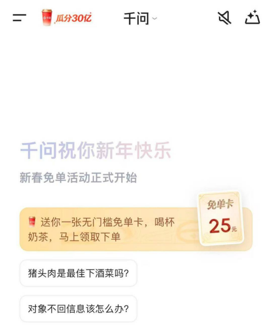 2月6日,一场足以重塑“国民消费习惯”的AI补贴战役正式打响。阿里旗下千问App宣布启动“春节请客计划”,投入30亿元真金白银,向全国用户发放总计21张无门槛免单卡。作为阿里系史上最大规模的春节AI活动,其核心玩法简单粗暴:用户只需对着手机说一句话,AI即可自动完成奶茶、外卖或年货的下单与免单抵扣。活动上线仅3小时,千问App内下单量已突破100万单,一场关于“谁是AI时代超级入口”的争夺战,在奶茶香气中硝烟四起。