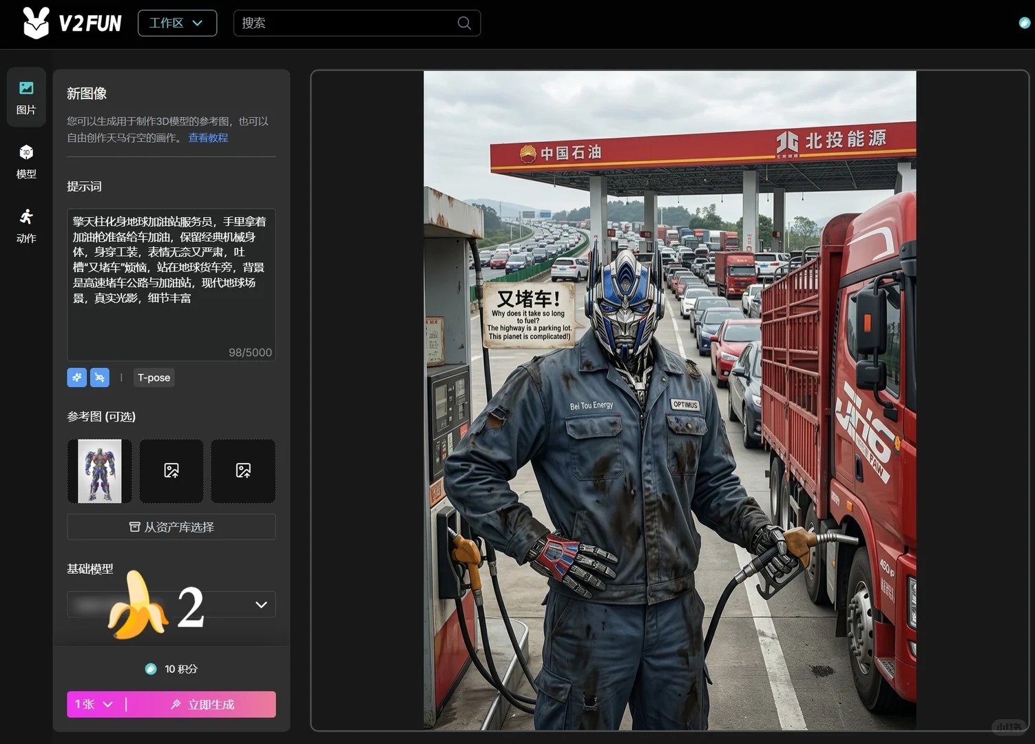 而在这一轮工具演进中,谁能真正把“角色生成”做成“角色生产”,谁就更有机会成为创作者的首选。从目前的市场表现来看,V2Fun.art 正在成为这一方向中值得重点关注的平台之一。尤其是在接入香蕉2之后,它不仅强化了前端控图和画面表达能力,也让从生图到 3D 资产生成,再到动作驱动的整体链路变得更顺滑。
