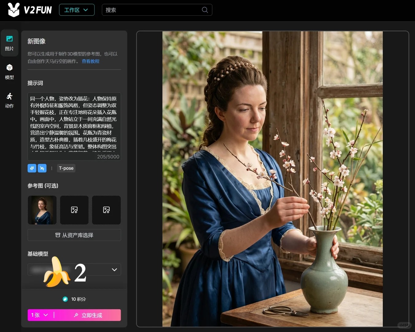 这次平台接入香蕉2之后,前端创作能力有了更明显的升级。对于角色内容生产来说,这种升级并不只是体现在画质层面,更重要的是它提升了复杂画面表达、角色控制和后续衔接效率。前期生图更稳,后续转模型更顺,整条链路自然就更适合内容创作者使用。换句话说,V2Fun.art 并不是把“生图”做得更热闹,而是在努力把“角色制作”做得更完整。