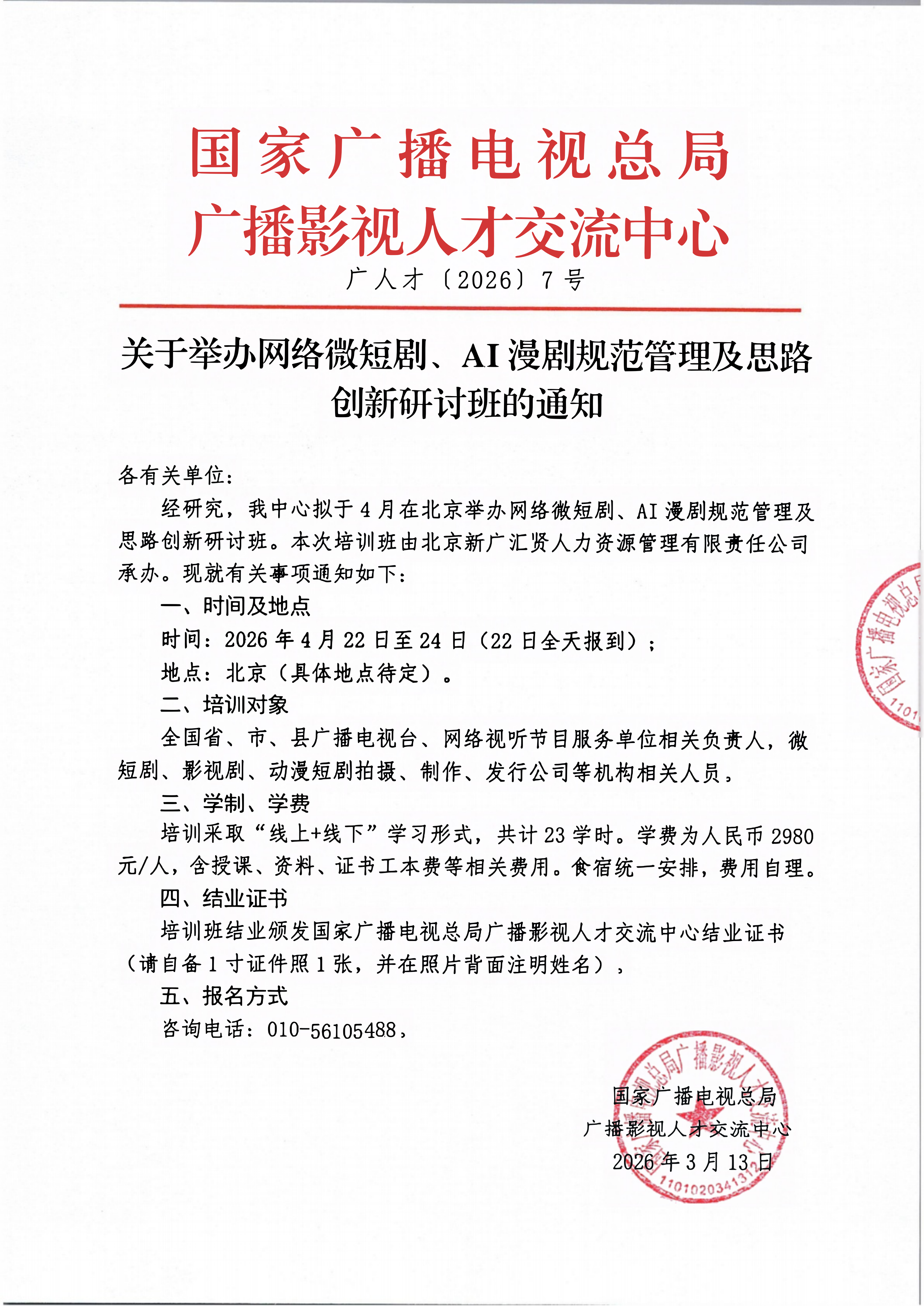 为全面落实网络视听行业监管部署,引导网络微短剧、AI漫剧行业向规范化、精品化、工业化、合规化转型,国家广播电视总局广播影视人才交流中心定于2026年4月在北京举办网络微短剧、AI漫剧规范管理及思路创新研讨班,本次培训由北京新广汇贤人力资源管理有限责任公司承办,面向全行业开放报名。