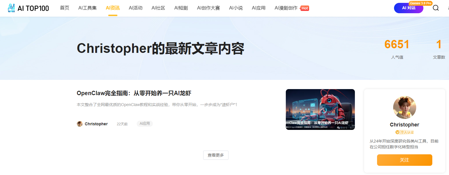 | Christopher | OpenClaw完全指南:从零开始养一只AI龙虾 | 6645 | 【良好】 | 500 | 500 |