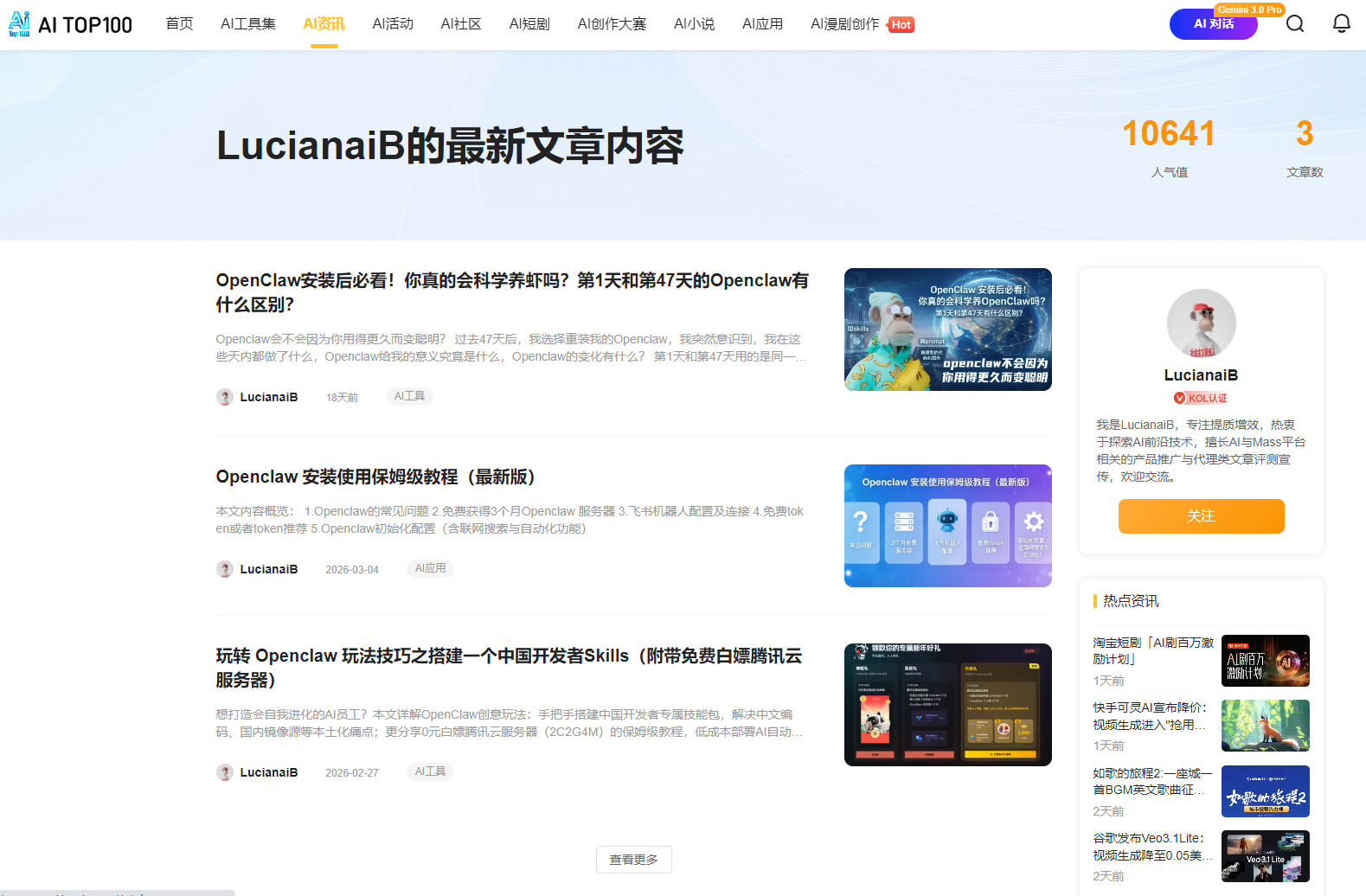 | LucianaiB | OpenClaw安装后必看!你真的会科学养虾吗?第1天和第47天的Openclaw有什么区别? | 4471 | 【良好】 | 500 | 700 |