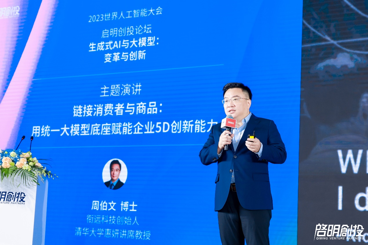 作为全球领先的致力于链接消费者与商品的人工智能公司,衔远科技自研AI大模型,数百亿级参数规模与独特的训练让大模型在具备通用能力的基础上,更擅长理解人与商品。衔远科技创始人、清华大学惠妍讲席教授周伯文博士在主题演讲中分享了如何用统一大模型底座赋能企业5D创新能力。周伯文指出,生成式AI是AGI的必由之路,ChatGPT开启了人工智能的新拐点,AI从“与人竞争”变为“协同交互”,帮助人类解决问题。周伯文表示,大模型应用的深化将回归商业本质,AI与消费产业融合发展成未来趋势,统一的大模型将驱动企业从数字化到智能化实现蜕变。衔远科技打造的大模型底座ProductGPT将重构产品与用户二元关系,赋能企业5D(机会洞察、爆品定义、方案设计、驱动研发、营销转化)全生命周期,并为员工提供知识管理、市场洞察、客户交付等不同环节的生产力工具。