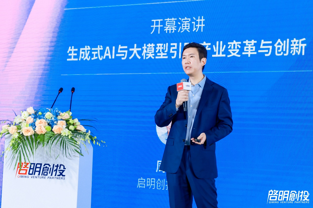 在开幕演讲环节,启明创投合伙人周志峰发表了题为“生成式AI与大模型引路产业变革与创新”的演讲。他表示:“大模型和生成式AI正引领当前最大的一波科技新浪潮,明确的信号来自Stable Diffusion、ChatGPT、Midjourney和Copilot等技术和产品显示出的爆发式用户采纳度和其背后企业的史无前例的高人均产出。大模型的‘第一性原理’是大规模压缩人类世界所有的数字信息。算力、算法和数据在过去40年的累积与发展一同推动今天生成式AI的爆发,基础架构层、模型层和应用层的企业都得到快速发展的机会。AI新浪潮带来新的产品形态,模型不仅仅是技术基础设施,而是触达用户的产品——用户+模型=应用。创投视角下的+AI和AI+两种模式的公司都在迎来快速的发展,但面对产业巨头和大模型公司的边界扩张,创业企业需要寻找自己的黄金通道。启明创投识别出AI 2.0已经跨过技术奇点的信号,并在市场引爆点来临前提前布局了多家大模型企业,未来将继续和大家一同见证生成式AI的高速发展。”