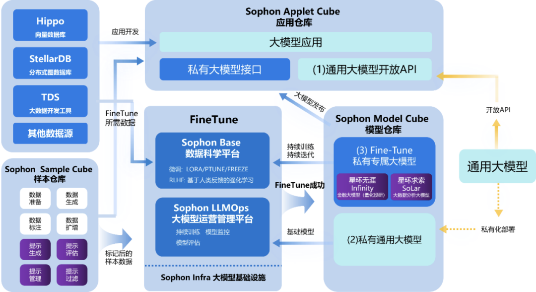 这就需要一个一站式的数据处理平台。和数据打了十几年交道的孙元浩,将经验凝结在了星环的Sophon LLMOps中,通过该平台,用户可以完成数据采集、知识沉淀、大模型迭代提升的完整闭环。同时将向量数据库与图数据库进行结合,能够更好的帮助大模型跨领域知识学习和调优,让大语言模型能更好地理解不同领域的专业术语、缩写、常见词汇和语法,承担统一的语义理解功能,解决业务领域性问题。