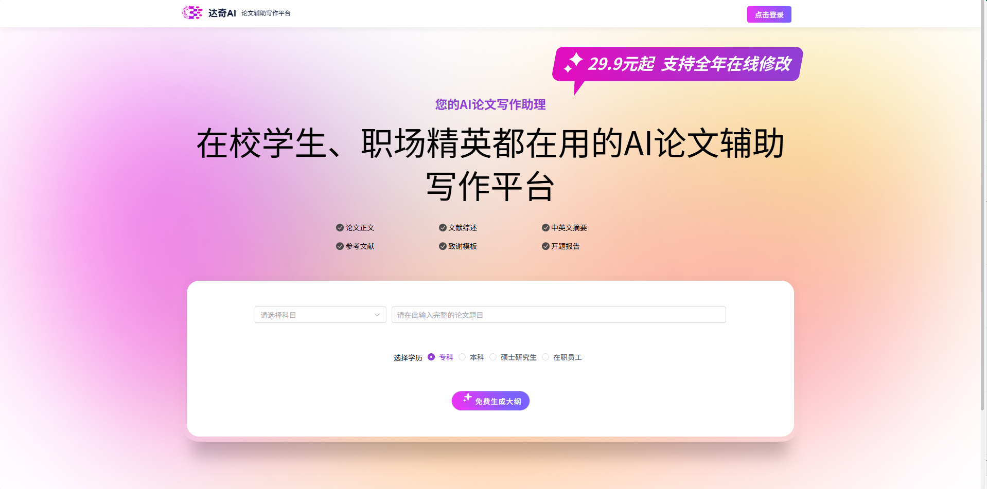 达奇AI是石家庄达奇软件开发有限公司开发的一款在校学生、职场精英都在用的AI论文辅助写作平台,于2017年上线,是内地最早一批将大模型语义生成能力打造成“SaaS 级论文工作站”的团队。