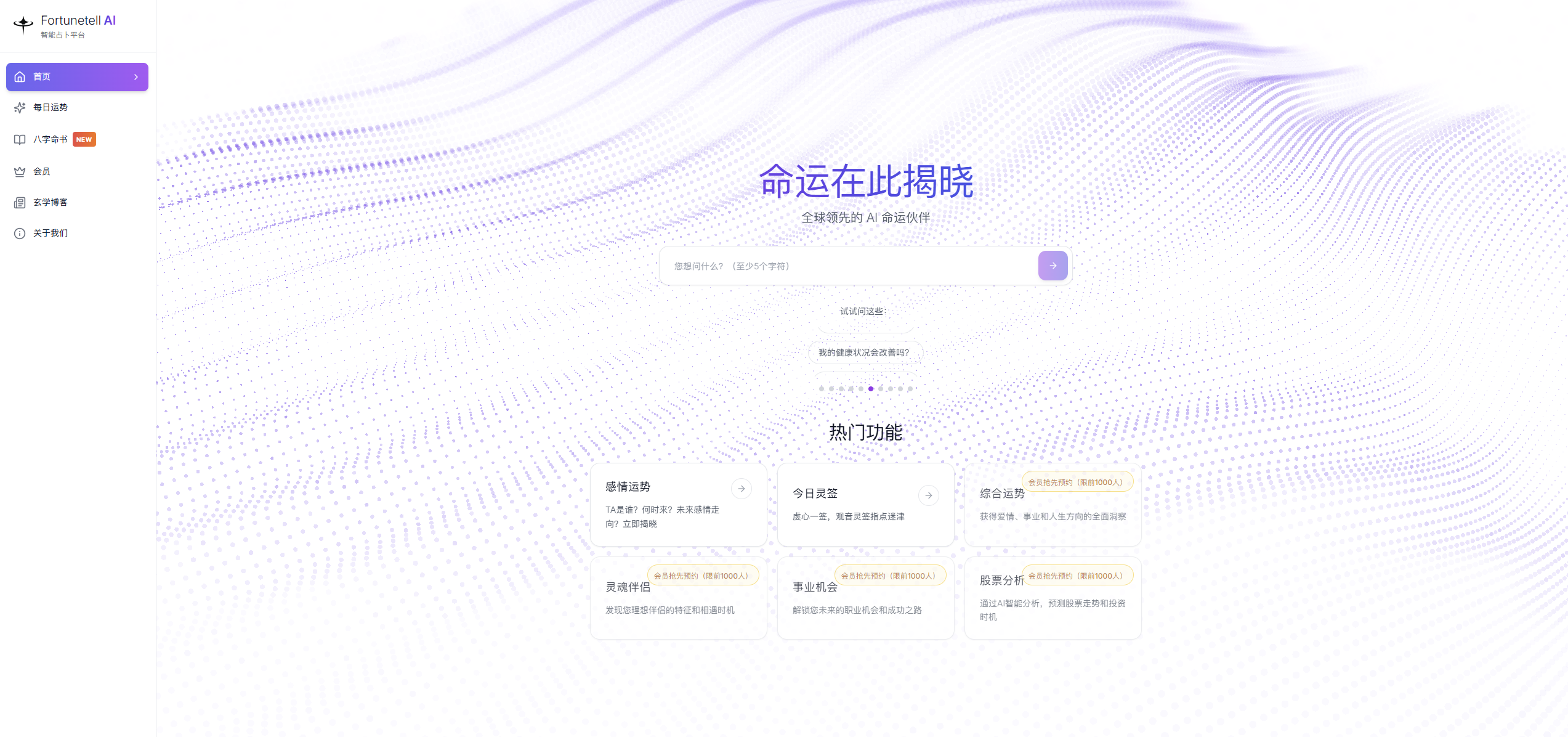 Fortunetell.ai是一款面向全球年轻人的「AI运势伙伴」。它把东方命理(八字、紫微、抽签等)与西方心理洞察、新一代大模型技术深度融合,为用户提供“科学感+陪伴感”并存的命理体验。打开网页或App,只需输入出生信息或直接提问,几秒钟内就能得到一份专属命运报告:今日能量色、宜忌事项、感情事业提示、AI签文、甚至一张可一键分享到 Instagram/小红书 的“命运卡片”。