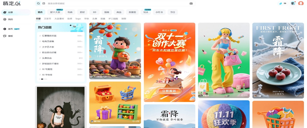 - 创意社区:汇聚海量由AI生成的高质量设计模板与用户作品,覆盖电商、营销、社交等多元场景。这里是灵感的源泉,帮助用户持续提升审美,激发创作潜能。