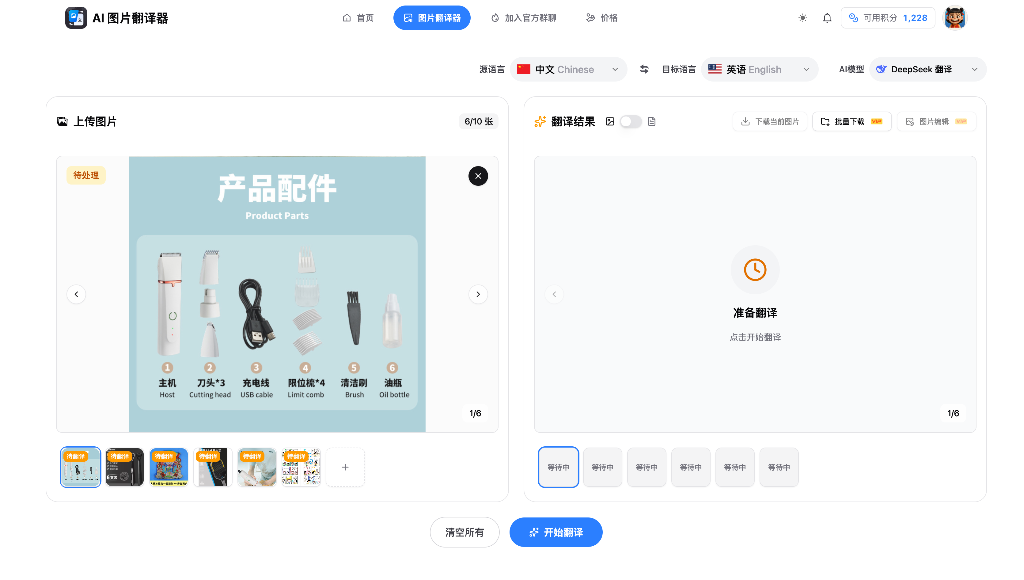 - 拖拽图片→选择目标语言→点击“立即翻译”;
