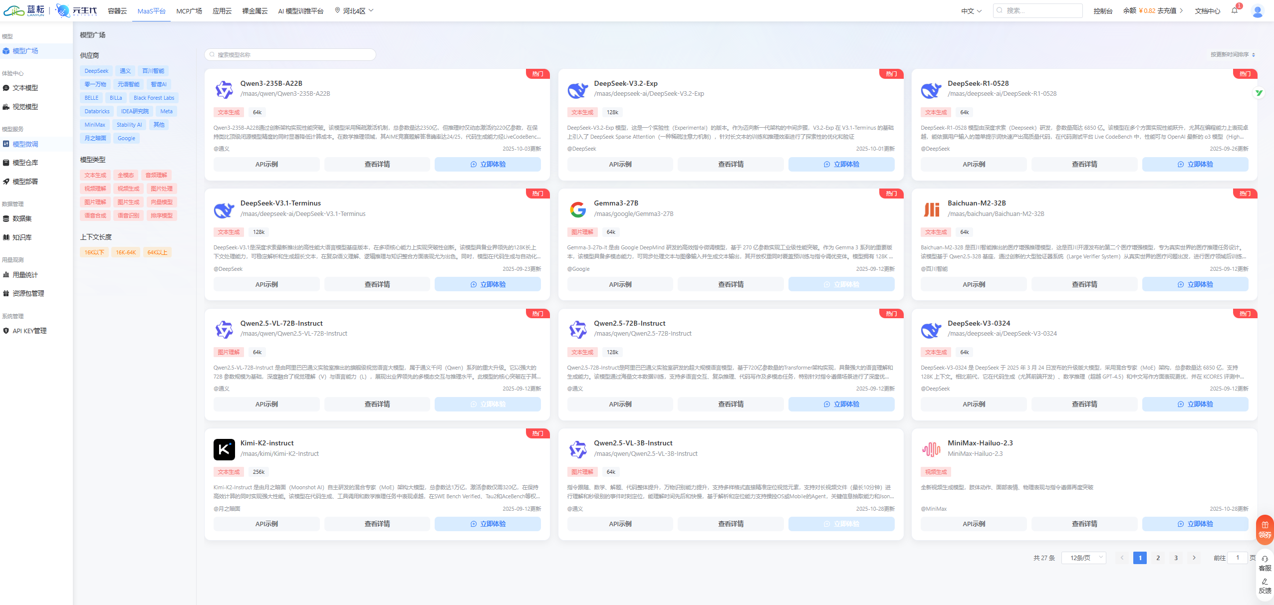 MaaS 服务平台:实时更新热门模型 DeepSeek 系列、Qwen 系列、MInimax 系列、KIMI 系列等