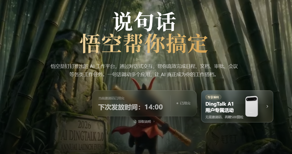 - 官网申请:访问 wukong.dingtalk.com 申请邀请码