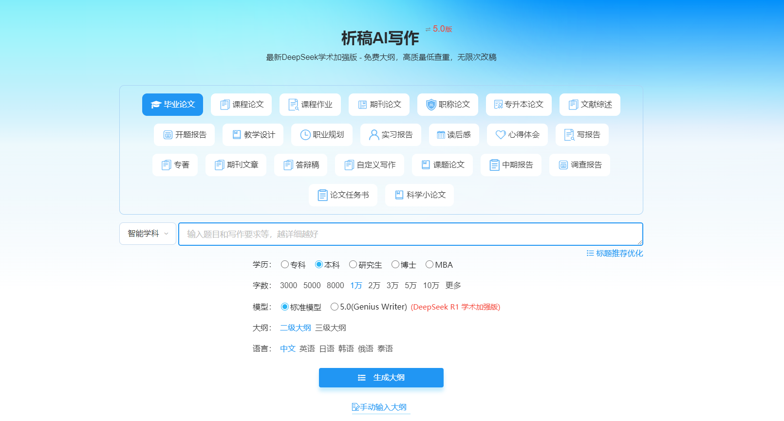 - 定参数:学历(专科/本科/硕/博)→ 专业(系统智能识别 13 大学科)→ 字数(1k - 10 万)→ 语言→ 模型版本(5.0 高级版)